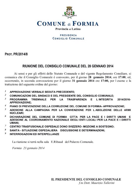 Situazione ospedaliera e centro trasfusionale. Se ne discuterà in Consiglio Comunale nella seduta fissata in prima convocazione per martedì 28 gennaio alle ore 17 ed eventualmente in seconda convocazione per venerdì 31 gennaio, sempre alle ore 17. Dopo l’approvazione del verbale della seduta precedente, le comunicazioni del Sindaco Sandro Bartolomeo e del presidente del Consiglio Comunale Maurizio Tallerini, l’assise darà il via libera al programma triennale per la Trasparenza e l’Integrità relativo agli anni 2014-2016 e, successivamente, all’approvazione del Piano di Prevenzione della Corruzione. A seguire si discuterà l’adesione del Comune di Formia alla Campagna per la Convenzione per l’abolizione delle armi nucleari. Il Consiglio delibererà poi la Dichiarazione del Comune di Formia “Città per la pace e i diritti umani” e l’adesione al Coordinamento Nazionale degli Enti Locali per la Pace e i Diritti Umani. Si discuterà poi di sanità. In prima analisi, del centro trasfusionale all’ospedale Dono Svizzero, come noto a rischio chiusura. Sarà presentata una mozione a sostegno del mantenimento del servizio. Seguirà il dibattito sulla situazione ospedaliera e le ipotesi in campo per potenziare il Dono Svizzero.