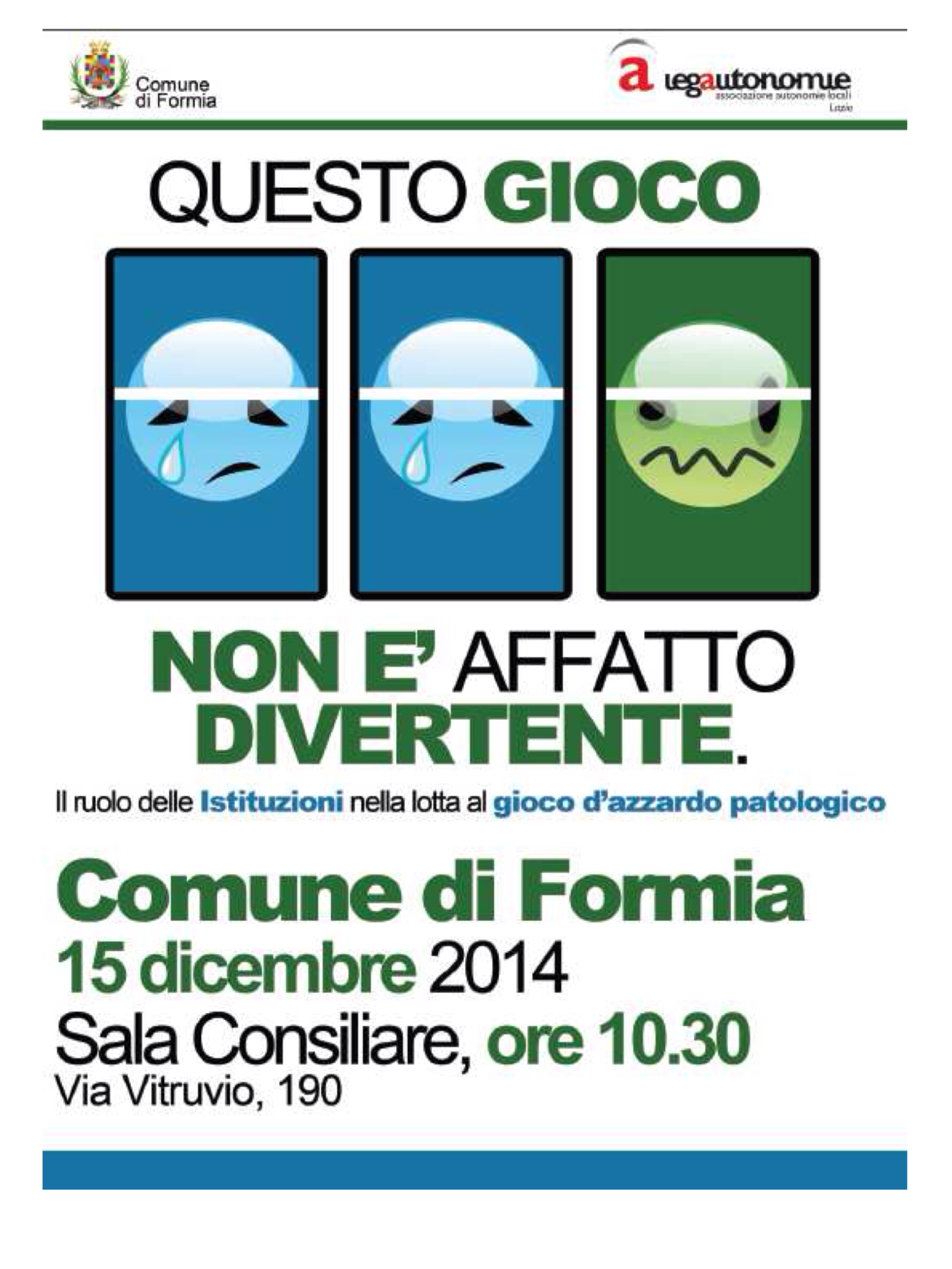 Dopo i saluti del Sindaco Sandro Bartolomeo e l’introduzione di Bruno Manzi, Presidente di Legautonomie Lazio, prenderà la parola Angela Fioroni di Legautonomie Nazionale con la relazione dal titolo “Il Manifesto dei Sindaci contro il gioco d’azzardo: un’opportunità per gli Enti Locali”. Sarà poi il turno dell’avvocato Veronica Fedele, responsabile dello Sportello Comunale Antiusura, oltre che membro dell’Osservatorio Comunale per la legalità e la lotta alle mafie, che interverrà sul fenomeno del gioco d’azzardo in terra pontina. De “L’impegno istituzionale: dal Comune di Formia l’esempio per contrastare il gioco d’azzardo” parlerà invece l’avvocato Patrizia Menanno, Delegata alla Legalità e Pari Opportunità del Comune di Formia. Di “Azzardo e usura nell’Italia della recessione” parlerà invece il Professor Maurizio Fiasco, sociologo, consulente della Consulta Nazionale Antiusura e uno dei massimi esperti nazionali del settore. “Gioco d’azzardo patologico: criteri di rilevanza ed effettività della tutela per un approccio sistematico” sarà invece il tema trattato dall’avvocato Attilio Simeone, Coordinatore Nazionale del Cartello ‘Insieme contro l’Azzardo” e membro della Consulta Nazionale Antiusura. Conclusione affidata all’on. Rosy Bindi, Presidente della Commissione d’inchiesta sul fenomeno delle mafie e sulle altre associazioni criminali, anche straniere. Interverranno anche Sesa Amici, Sottosegretaria alla Presidenza del Consiglio dei Ministri e Claudio Moscardelli, membro della Commissione antimafia. Modera i lavori Paola Manca, di Legautonomie Nazionale.
