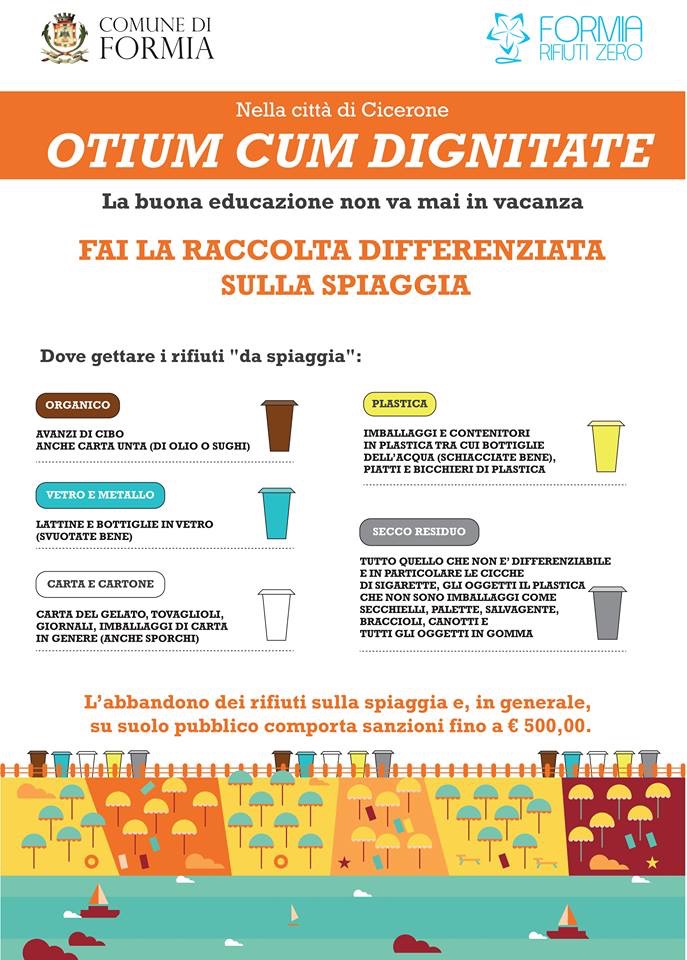 La “Formia Rifiuti Zero” lancerà nei prossimi giorni una campagna di informazione volta ad informare operatori e bagnanti sulle modalità di smaltimento differenziato dei rifiuti sulle spiagge della città. Nel promuovere il patrimonio storico e archeologico di Formia – lo slogan è “Nella città di Cicerone Otium cum dignitate – La buona educazione non va mai in vacanza” –, i cartelli installati sugli arenili indicheranno agli utenti delle spiagge come e dove gettare i rifiuti prodotti durante la loro permanenza sugli arenili. Descritte in modo specifico frazioni e modalità di conferimento per ogni tipologia di rifiuto: