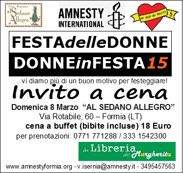 Domenica 8 marzo, ore 20.00, presso il Ristorante “Al Sedano Allegro” di Formia (via Rotabile, 60) si organizza la nona edizione di “Donne in Festa….vi diamo più di un motivo per festeggiare”, una cena-buffet a soli 18 Euro (incluse le bevande) per festeggiare insieme tutte le buone notizie relative ai Diritti delle Donne.