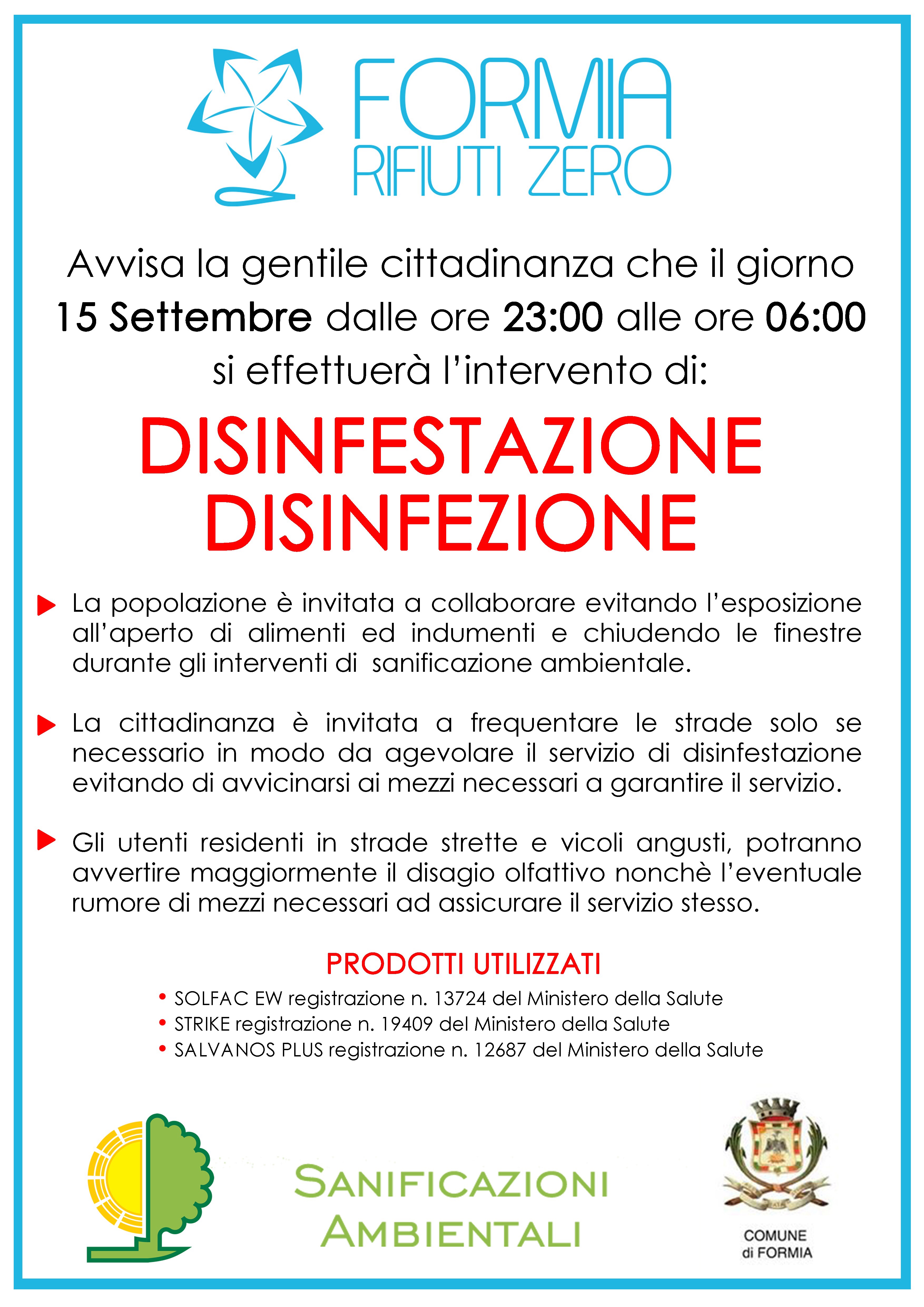 Il giorno 15 settembre dalle ore 23.30 alle ore 06:00, la società “Formia Rifiuti Zero” effettuerà servizi di disinfestazione e disinfezione sulle strade del territorio comunale.