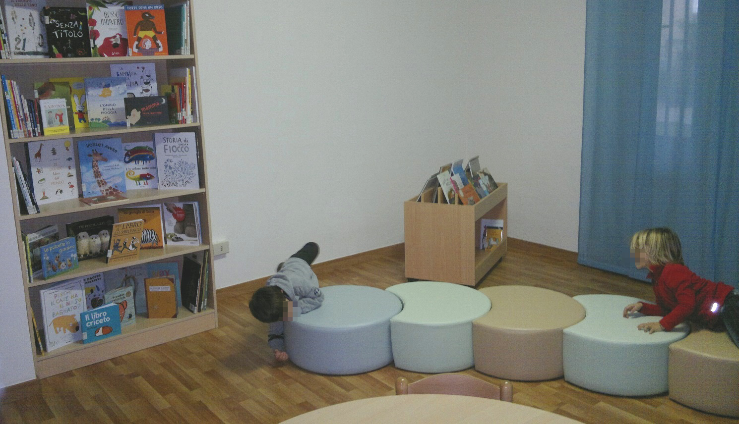 1) Da zero a tre anni: Nella sala dedicata ai bebè ci sono libri di sole immagini, con racconti di poche parole, cartonati, di forme e materiali particolari. La stanza dispone di tappeti e cuscini e di un angolo dove le mamme possono allattare i bebè;