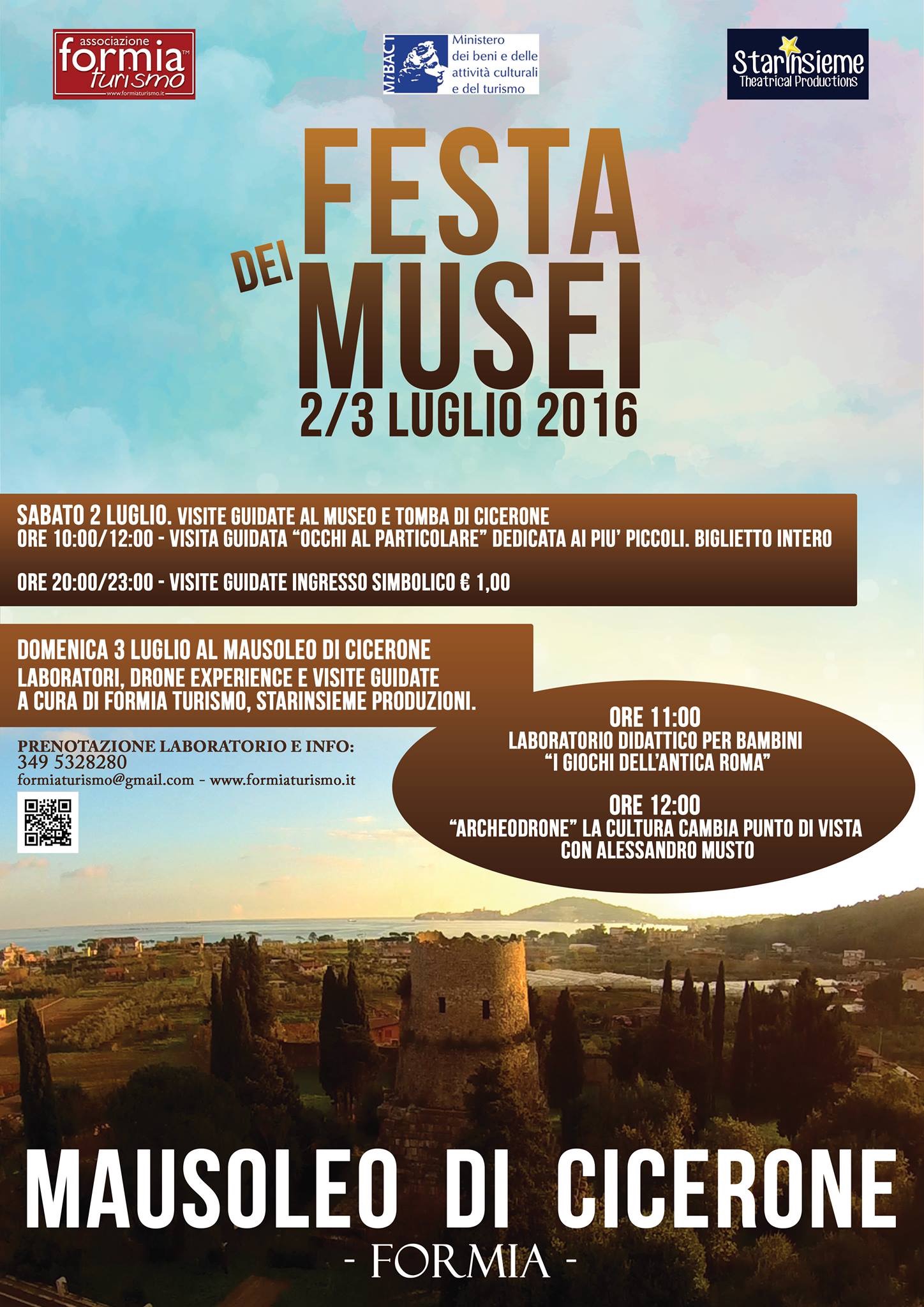 Nell’ambito della Festa dei Musei 2016, l’Associazione Formia Turismo organizza piccole iniziative per rendere fruibile a tutti uno dei luoghi simbolo della città di Formia. Domenica 3 Luglio 2016 dalle ore 10,00 alle ore 13,00 Apertura straordinaria della Tomba di Cicerone e del giardino, con ingresso gratuito per Adulti e Ragazzi.