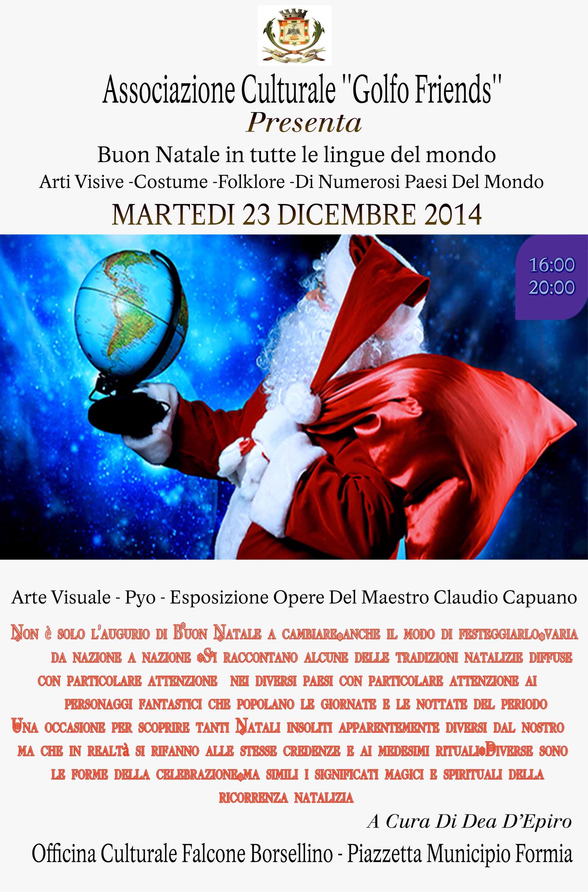 “Buon Natale in tutte le lingue del mondo”. E’ il titolo dell’iniziativa che l’Associazione Culturale “Golfo Friends” ha organizzato all’Officina Culturale Falcone-Borsellino per domani martedì 23 dicembre, a partire dalle ore 16 fino alle 20.