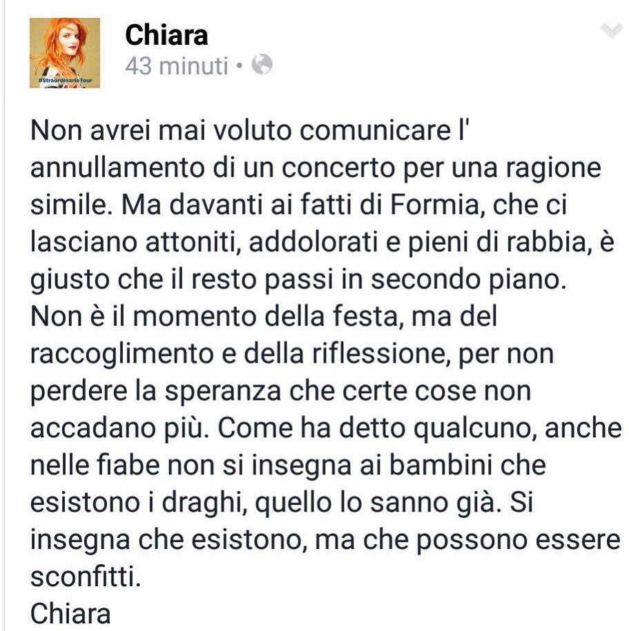 La cantante Chiara ha annunciato l’annullamento del suo concerto previsto a Formia in occasione delle Festività in onore dei Santi Patroni Erasmo e Marciano.