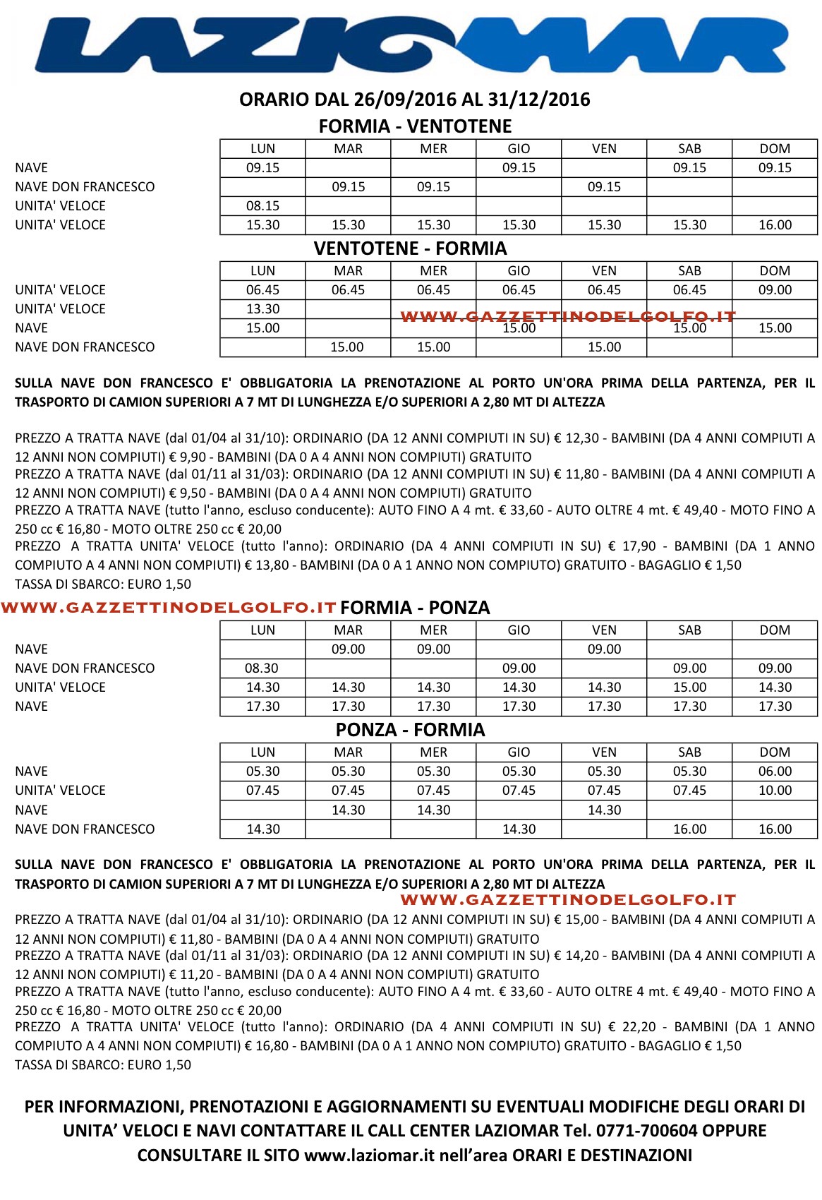 La società Laziomar comunica i nuovi orari per i collegamenti Formia-Ponza e Formia-Ventotene in vigore dal 26 settembre sino al 31 dicembre p.v.. Ecco in allegato il file completo deli notizie di carattere informativo e tabella orari di partenza ed arrivo tra il Golfo di Gaeta e le Isole Pontine di Ponza e Ventotene.