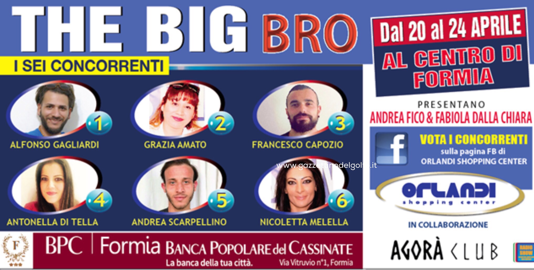 Dal 20 al 24 Aprile 3 ragazze e 3 ragazzi vivranno esperienze uniche nella vetrina dell’Orlandi Shopping Center.Da Mercoledi 20 fino a Domenica 24 tanti eventi al centro della citta’ di Formia con il coinvolgimento di tantissime attivita’ economiche della nostra zona e delle isole di Ponza e di Ventotene, tutte insieme nella stessa vetrina.