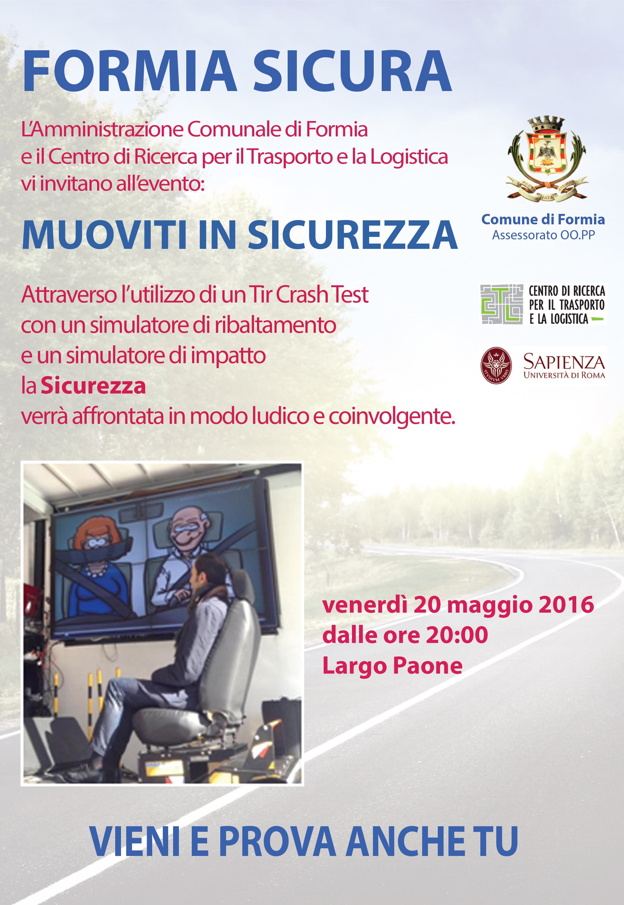 Test pratici con il “Tir Crash Test” per simulare l’esperienza di un incidente stradale e ricordare a tutti quanto importante sia guidare con prudenza. Venerdì 20 maggio la città di Formia ospiterà “Muoviti in Sicurezza”, l’evento di sensibilizzazione organizzato dall’Amministrazione comunale in collaborazione con il Centro di Ricerca per il Trasporto e la Logistica dell’Università “La Sapienza” di Roma. La manifestazione rientra nel progetto “Formia Sicura” che mira a ridurre l’incidentalità diffondendo la conoscenza delle tematiche relative alla sicurezza stradale.