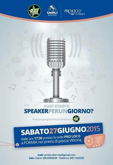 Nel pomeriggio di ieri abbiamo lanciato un nuovo programma radiofonico dalla sede della Pro loco Formia. La manifestazione ideata in collaborazione con Rav Radio Antenna Verde ha come finalità la selezione di un aspirante speaker radiofonico. Al termine di una serie di appuntamenti estivi, infatti, sarà selezionato uno dei partecipanti che potrà eseguire sei mesi di tirocinio presso la radio RAV usufruendo delle agevolazioni regionali di garanzia giovani e fondo ministeriale. L’aspirante giovane speaker radiofonico potrà realizzare un piccolo sogno ed avvicinarsi al mondo del lavoro.
