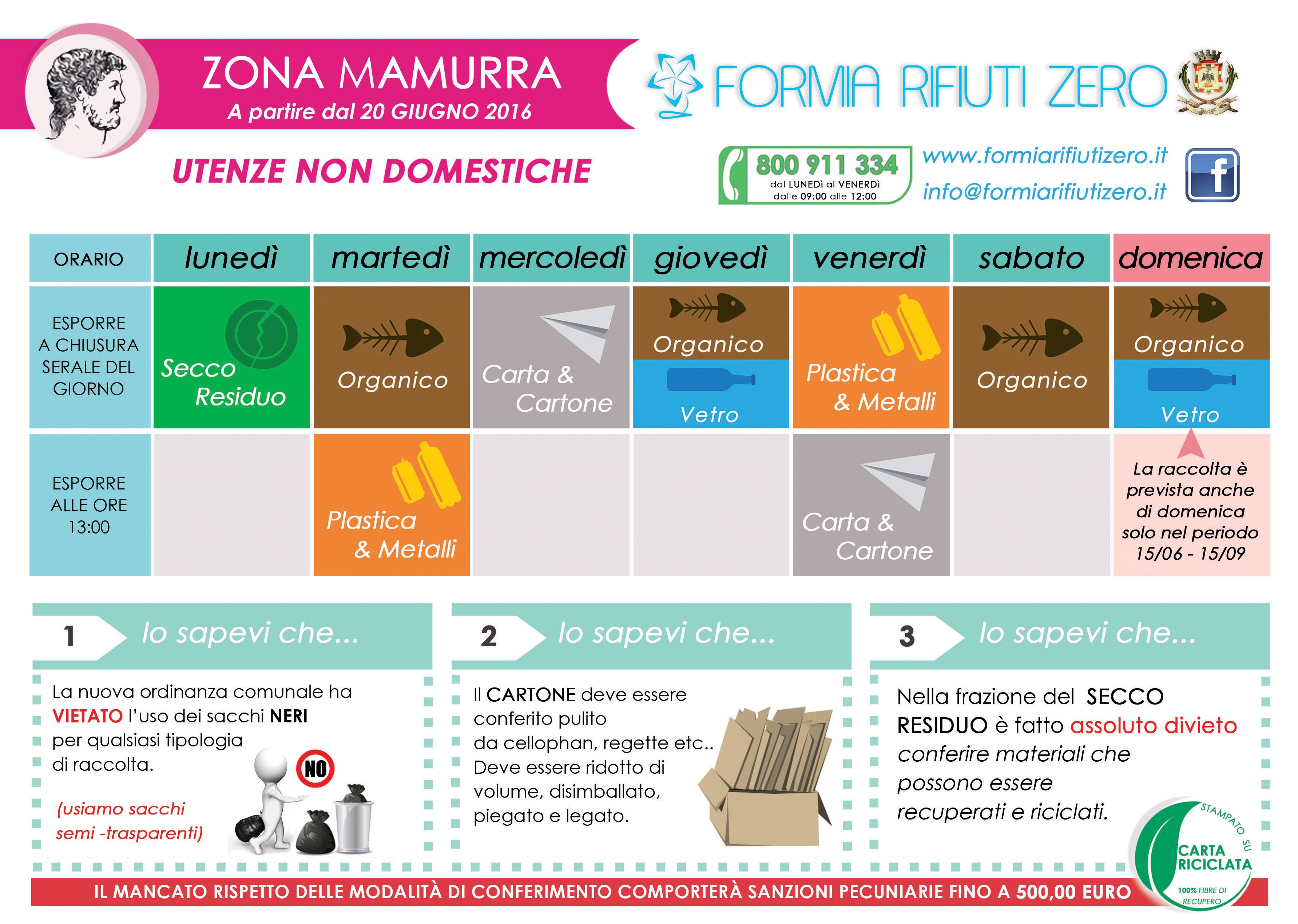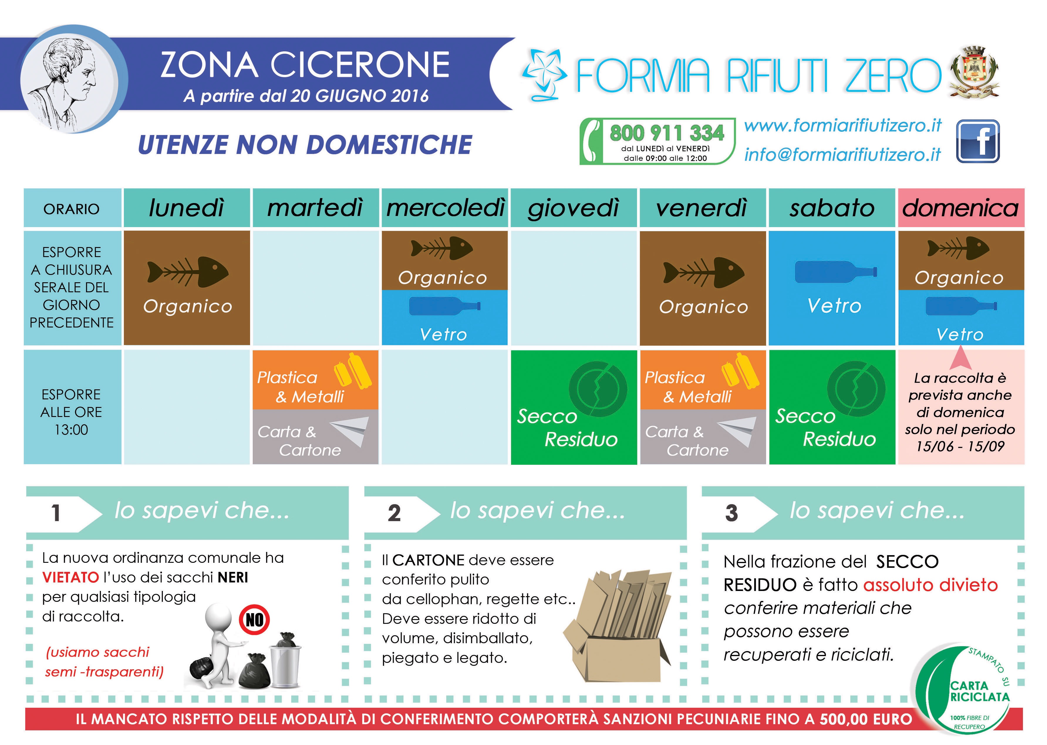 UTENZE NON DOMESTICHE – I giorni di raccolta sono stati ridistribuiti sulla base delle necessità dei singoli commercianti e, in particolare, nel periodo estivo (dal 15/06 al 15/09) è stato introdotto il servizio di raccolta del vetro e dell’organico anche di domenica, in modo da favorire determinate attività quali Bar e Ristoranti.