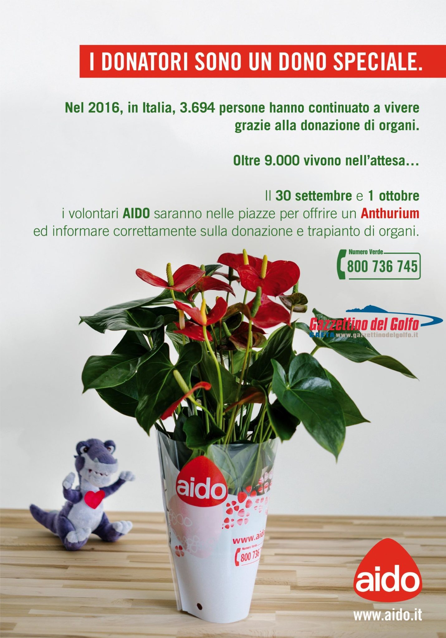 Si rinnova l’appuntamento “Un Anthurium per l’informazione”, la campagna di sensibilizzazione sulla donazione organi promossa da A.I.D.O. – Associazione Italiana per la Donazione di Organi, Tessuti e Cellule, che sarà presente con i suoi volontari nelle principali piazze italiane, sabato 30 settembre e domenica 1 ottobre.