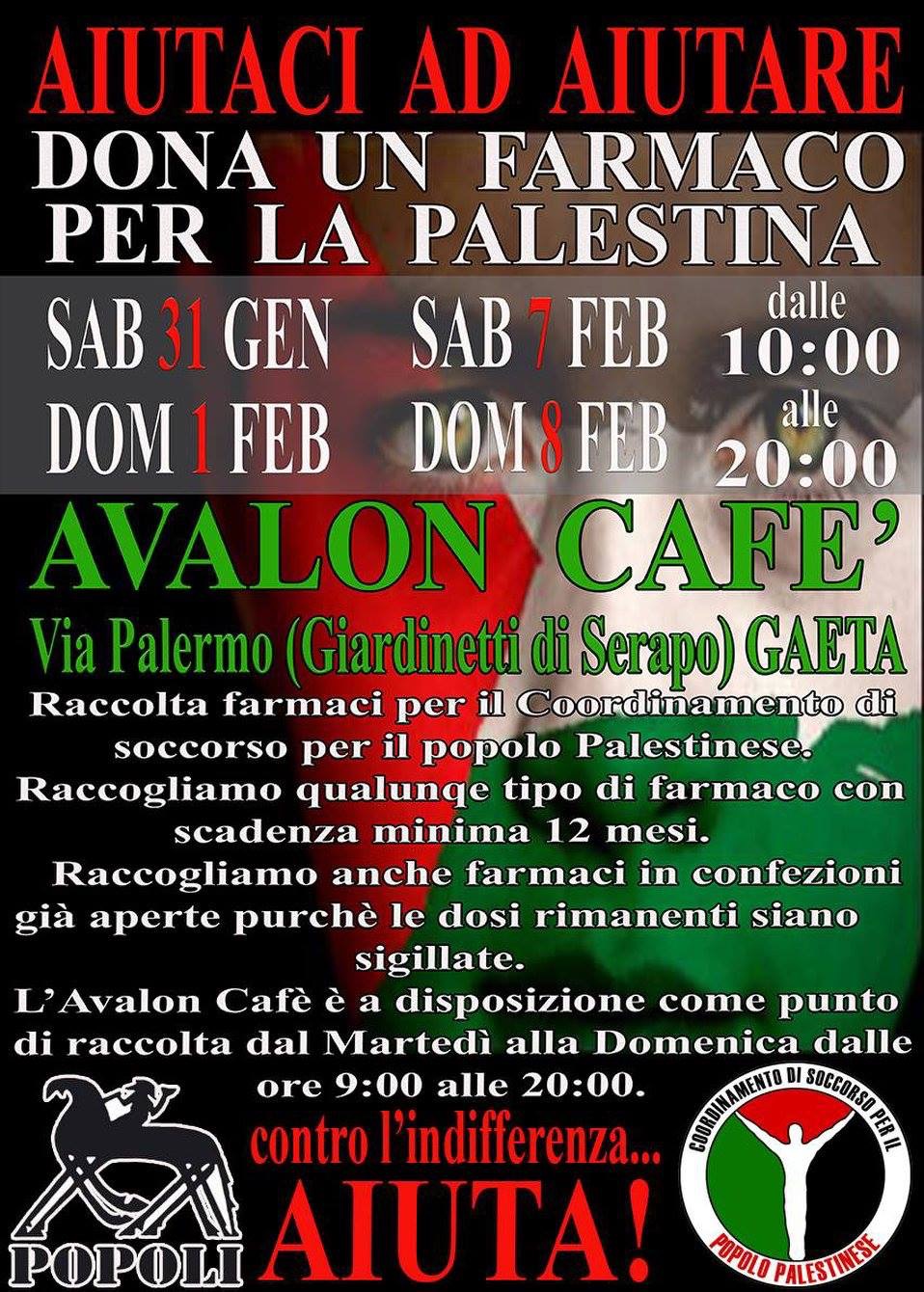 Una raccolta farmaci per il coordinamento di soccorso per il popolo Palestinese si terrà a Gaeta presso il noto Avalon Cafè, nelle adiacenze della Villa Pietro Palumbo in via Palermo.