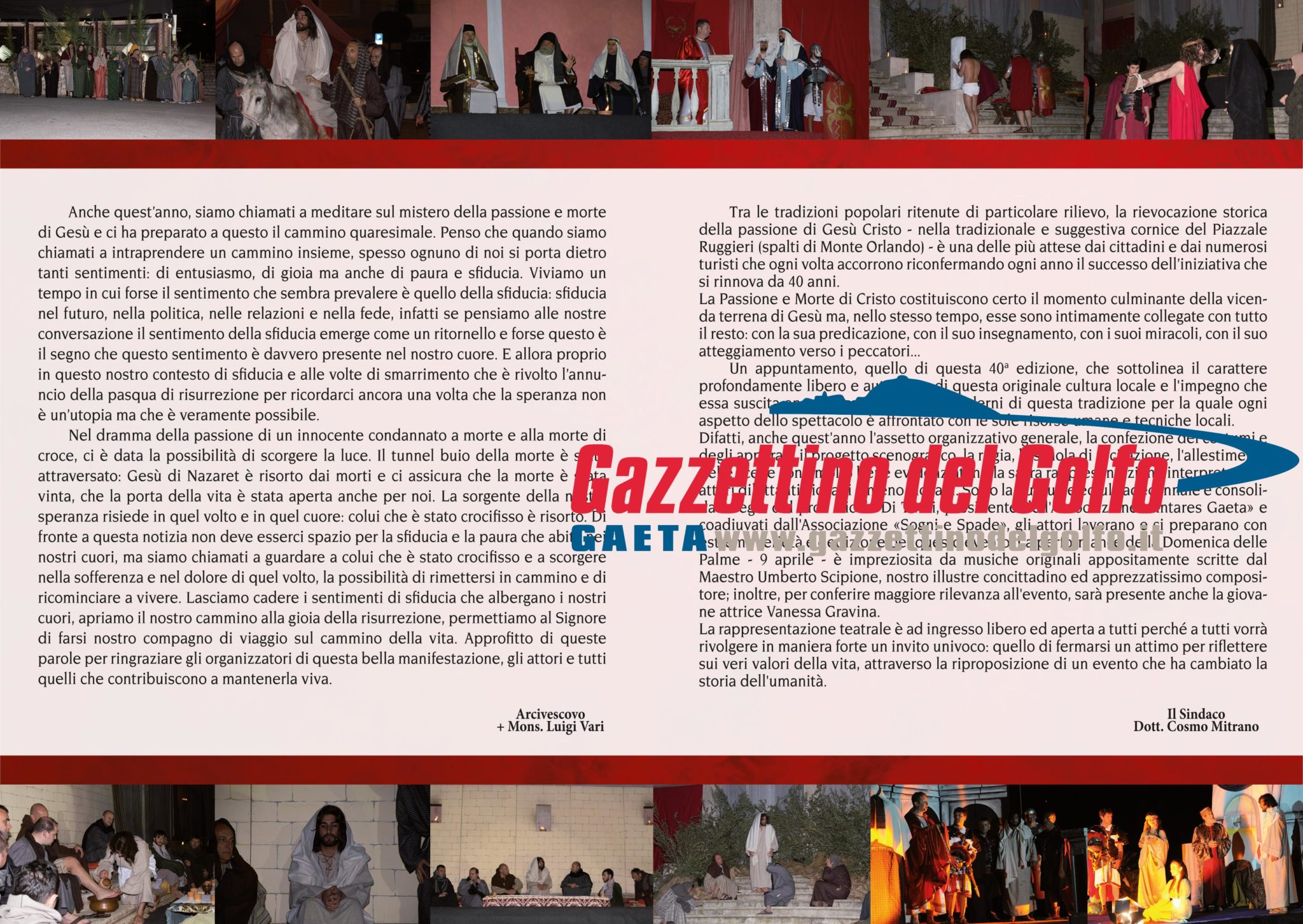 Come ha avuto modo di affermare il dott. Cosmo Mitrano, Sindaco di Gaeta, nel messaggio pubblicato sulla brochure 2017: «Tra le tradizioni popolari ritenute di particolare rilievo, la rievocazione storica della passione di Gesù Cristo – nella tradizionale e suggestiva cornice del Piazzale Ruggieri (spalti di Monte Orlando) – è una delle più attese dai cittadini e dai numerosi turisti che ogni volta accorrono riconfermando ogni anno il successo dell’iniziativa che si rinnova da 40 anni».