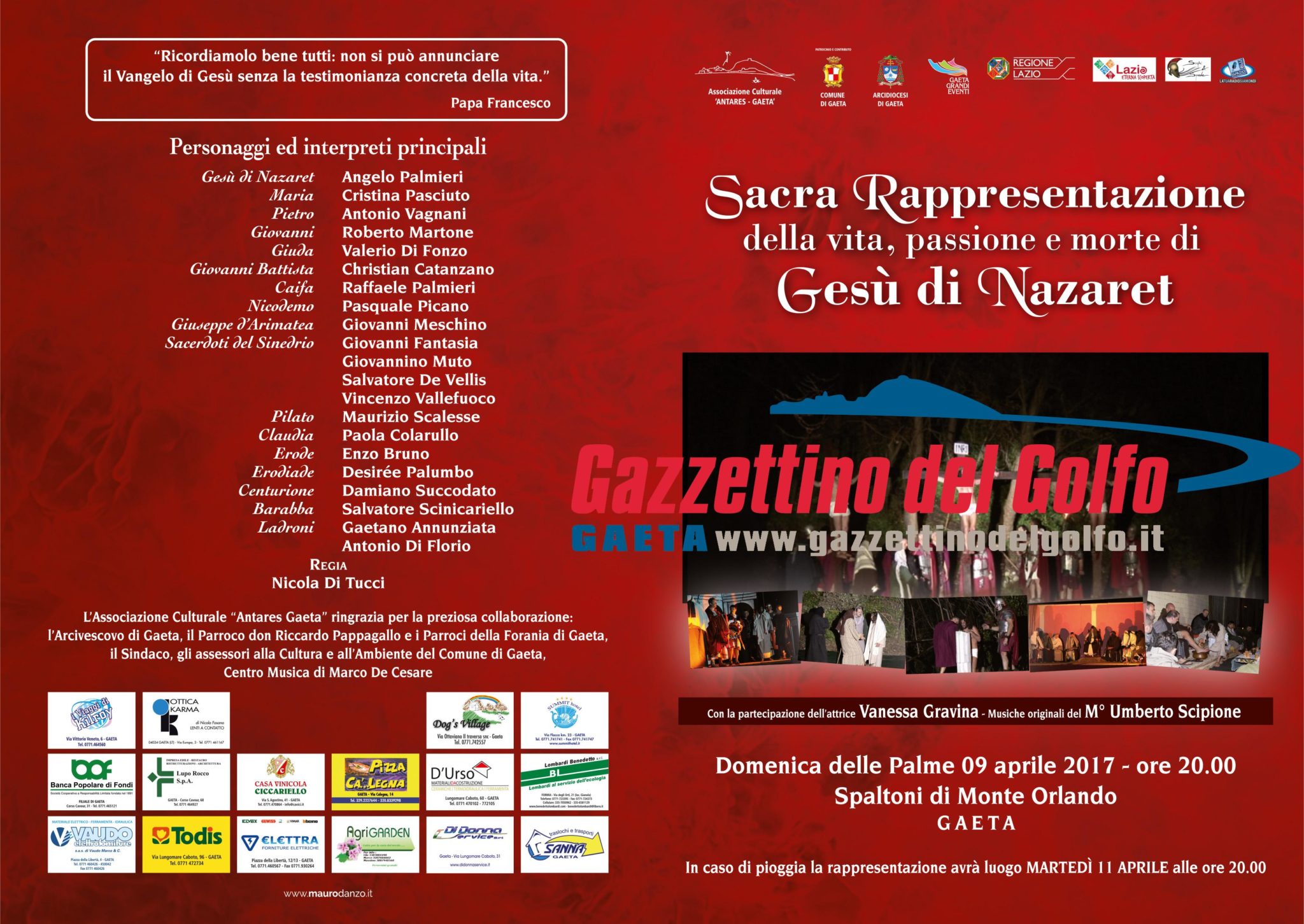 Realizzata con il patrocinio e contributo del Comune di Gaeta, la Sacra Rappresentazione è entrata a far parte dei grandi eventi della città e ogni anno sono sempre più numerosi coloro che si impegnano nella recitazione, nella preparazione dei costumi e delle scenografie, nell’allestimento degli aspetti tecnici.