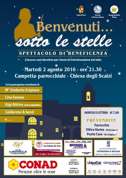 L’appuntamento è con lo Spettacolo Benvenuti sotto le Stelle, organizzato dalla Parrocchia SS. Cosma e Damiano, l’Associazione Oratorio SS. Cosma e Damiano il Borgo, con il patrocinio ed in collaborazione con il Comune di Gaeta. Un obbiettivo importante da raggiungere: raccogliere fondi per contribuire alla ristrutturazione del tetto della chiesa. L’incasso della serata sarà infatti devoluto in beneficenza per questa causa.