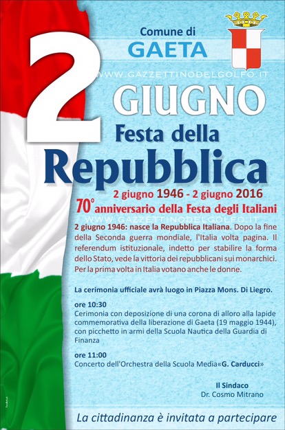 Gaeta si prepara a celebrare la Festa della Repubblica che avrà luogo nella mattinata di mercoledì 2 giugno.