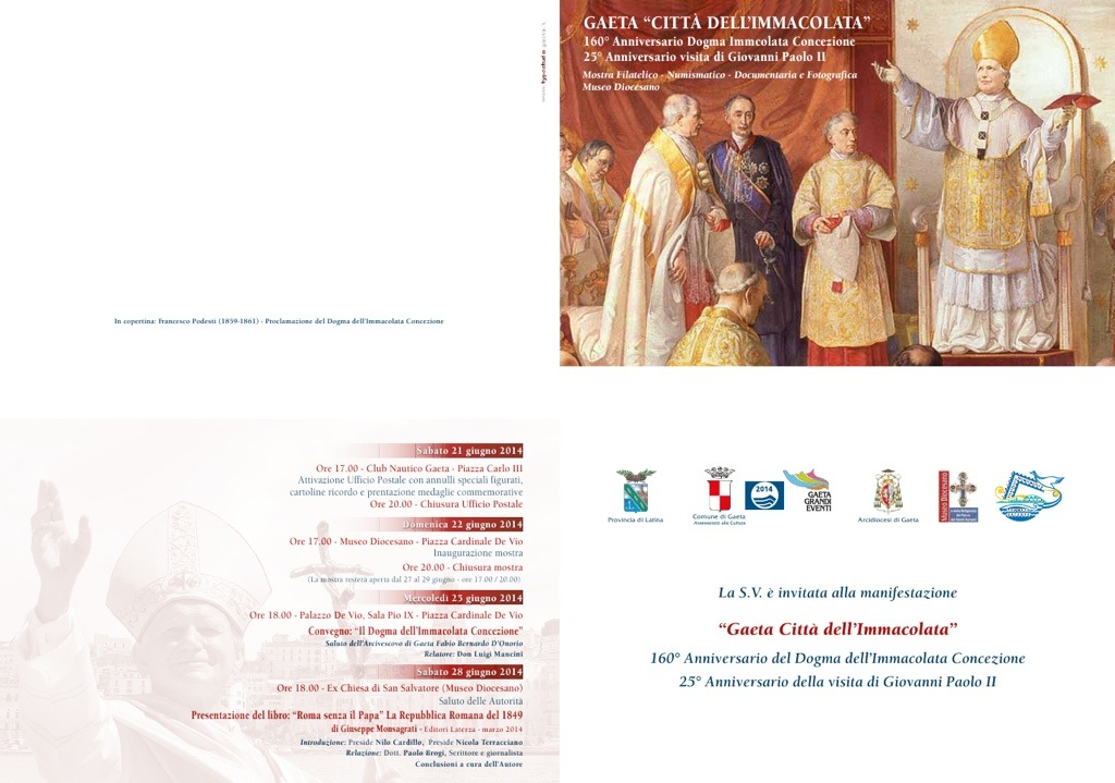 Il Circolo Filatelico Numismatico “Tommaso Valente” Gaeta sta per dare il via agli eventi conclusivi che celebreranno il 160° Anniversario della Proclamazione del Dogma dell’Immacolata Concezione ed il 25° Anniversario della visita di Papa Giovanni II a Gaeta. Evento quest’ultimo che acquista una maggiore importanza dato che Papa Giovanni Paolo II è stato recentemente canonizzato dichiarato cioè Santo. Quel 25 giugno del 1989 ha rappresentato per Gaeta e per alcune città del Golfo un momento che mai potrà essere dimenticato e per chi ha avuto la fortuna di esserci qualcosa di indimenticabile sotto l’aspetto spirituale ed umano. Momenti che ognuno dei presenti porterà per sempre nel proprio cuore. Come dimenticare il Papa che proclama Gaeta “Città dell’Immacolata“. La manifestazione comincerà il 21 giugno alle ore 17,00 presso il Club Nautico con la presentazione delle due medaglie in bronzo celebrative degli anniversari e con l’apertura di apposito ufficio postale che porrà in essere due annulli filatelici speciali figurati mentre il Circolo curerà la stampa di cartoline ricordo degli eventi. Il programma prevede una mostra filatelico numismatico documentaria e fotografica presso il Museo Diocesano, un convegno sul Dogma dell’Immacolata Concezione nei locali di Palazzo Cardinale De Vio ed un convegno per la presentazione del Libro: “Roma senza il Papa” La repubblica Romana del 1849 scritto dal Professore Giuseppe Monsagrati per Editori Laterza – Marzo 2014, nell’ex chiesa di San Salvatore nei pressi del Museo Diocesano alle ore 18,00.