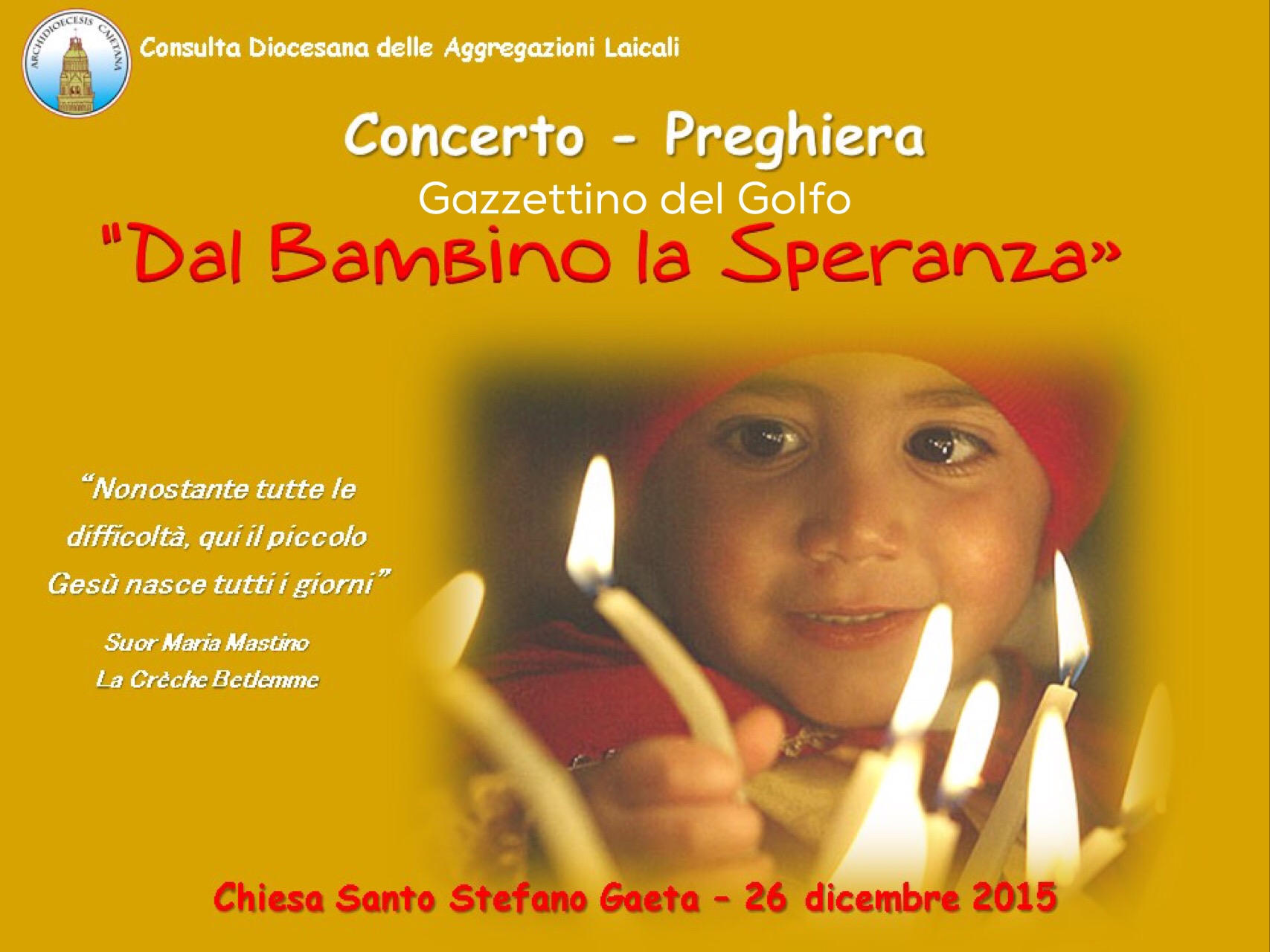 Sabato 26 dicembre alle ore 19.00 presso la Chiesa di Santo Stefano in Gaeta, il gruppo della Consulta Diocesana delle Aggregazioni Laicali di Gaeta presenterà la 3a edizione del Concerto-preghiera “Dal Bambino, la Speranza”, per un momento di riflessione pacata e silenziosa attraverso musica e parole che si alternano a passi di meditazione e pagine di preghiera.