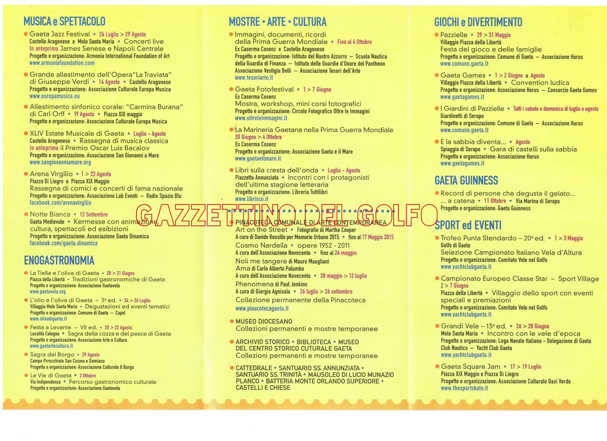 Arte, cultura, musica, enogastronomia, tradizioni e sport, altre straordinarie bellezze vi attendono a Gaeta dove, anche quest’anno si è programmato numerosi eventi e rassegne di generi diversi, indirizzati ad un pubblico di tutte le età. Ecco gli eventi in programma da maggio ad ottobre per “Gaeta d’Estate” 2015.