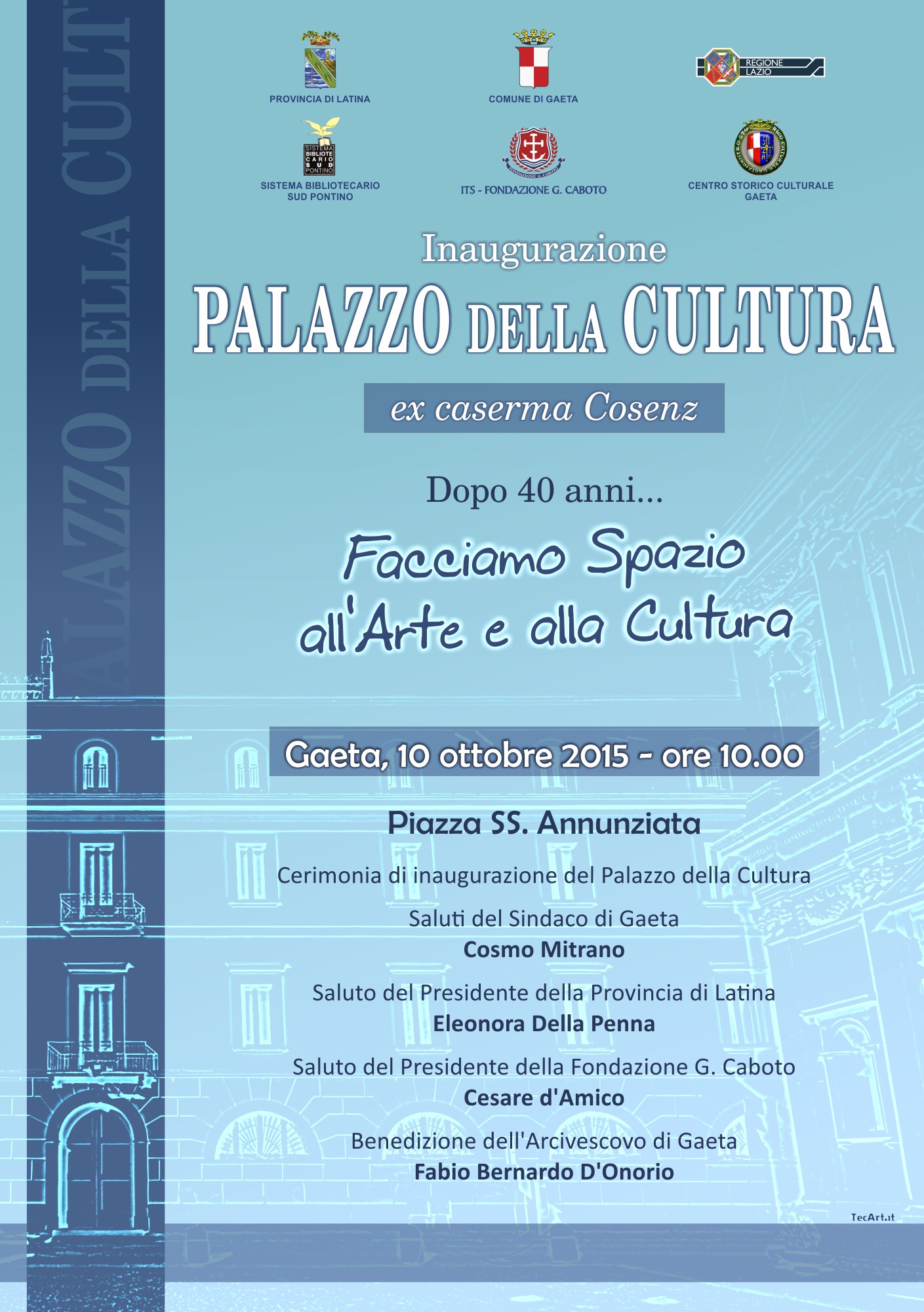 Sabato 10 ottobre 2015 inaugurazione del Palazzo della Cultura all’ex Caserma Cosenz, in Piazza SS. Annunziata. Dopo 40 anni facciamo spazio all’Arte e alla Cultura.