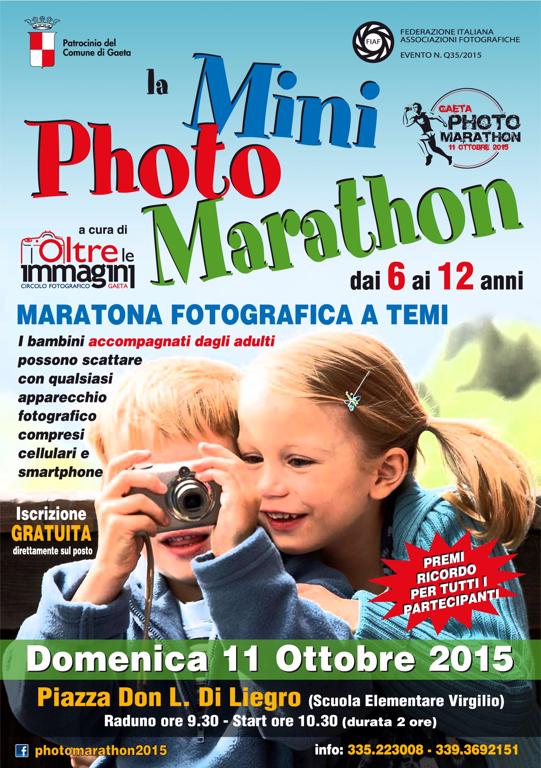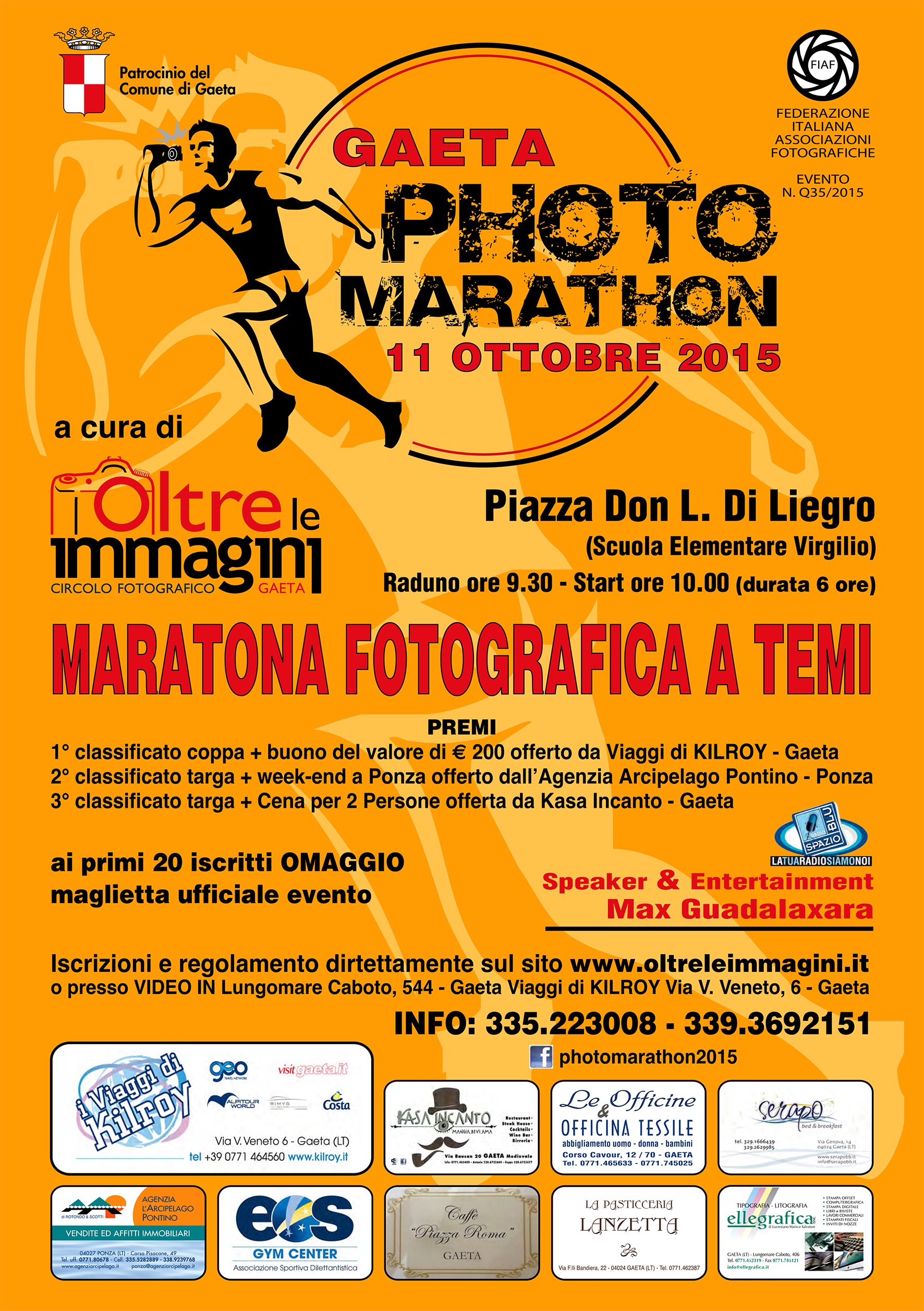 Il Circolo fotografico “Oltre Le immagini”, ancora una volta in prima linea per promuovere il territorio della bellissima Gaeta attraverso un innovativo evento dedicato alla fotografia,presenta il “Gaeta PhotoMarathon 2015“, patrocinato dal Comune di Gaeta, accreditato dalla FIAF, con la partecipazione dello speaker Max Guadalaxara. L’evento si terrà DOMENICA 11 OTTOBRE ORE 9.30 in Piazza Don L.Di Liegro per tutti gli appassionati di fotografia che vorranno cimentarsi nella “corsa di scatti” dei 6 temi in 6 ore. Sono previsti premi per i vincitori e soprattutto è prevista una sezione dedicata ai bambini dai 6 ai 12 anni.