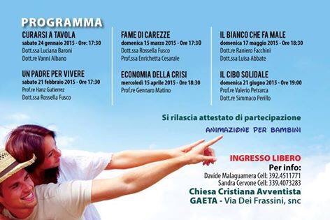Dopo il successo del primo incontro, ecco il secondo degli appuntamenti del programma “iSalute: perchè tu sei un essere speciale ed io avrò cura di te“, organizzato dalla Chiesa Cristiana Avventista del 7° Giorno di Gaeta, in collaborazione con deComporre APS, “Vita e Salute” e Nuovo Commercio Organizzato, col patrocinio del Comune di Gaeta. Sabato 21 febbraio, alle 17.30, in via dei Frassini, si tornerà a parlare di cura di sé, benessere, armonia, relazioni con gl’ altri, qualità della vita. Dopo “Curarsi a tavola”, sarà infatti la volta di “Un Padre per vivere”, incontro sul rapporto io-Dio e io-altri. Dopo aver analizzato dal punto di vista teologico il legame filiale con l’Amore Infinito (grazie ad una relazione del professor Hanz Gutierrez, docente di teologia dogmatica presso l’Università Avventista di Firenze), saremo aiutati a comprendere (con l’aiuto della dottoressa Rossella Fusco, psicologa e psicoterapeuta) come andrebbero vissuti nella nostra esperienza i legami ed i rapporti genitori-figli, quali incidenze sulla crescita armonica dell’individuo nelle diverse fasi della crescita e della vita. Lo star bene passa anche attraverso le giuste dinamiche relazionali oltre che dall’assumere atteggiamenti sani in relazione all’alimentazione, alla qualità della vita e dell’ambiente. Il senso di “famiglia“, inteso soprattutto come rapporti generazionali di aiuto e confronto, sarà analizzato partendo dalla riscoperta della bellezza di essere creature amate da un Creatore che non ci abbandona, ci perdona, ci dimostra concretamente il proprio amore paterno. Credenti e non credenti, quindi, avranno un’occasione di riflessione non solo spirituale o teologica, ma anche esperienziale e sociologica. Il tutto senza trascurare momenti culturali affidati alla musica (saranno con noi la violinista Angela Foddanu e la pianista Rita Fusco), alla letteratura, al teatro e alla poesia (con brani letti a cura dell’Associazione deComporre).Ma non è tutto: ospite specialissimo della serata lo Chef Vegan Riccardo Gessa che preparerà un piccolo buffet con ingredienti mediterranei e… a chilometro zero. A condurre la serata la giornalista Sandra Cervone e il Pastore Avventista Davide Malaguarnera. Ricordiamo che i partecipanti che ne faranno richiesta potranno ricevere (a giugno) un attestato di frequenza del Comune di Gaeta, presenziando ad almeno 4 dei 6 incontri previsti.