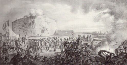 Presa d’assedio dalle truppe occupanti piemontesi comandate dal generale Cialdini, si difese eroicamente per diversi mesi, e solamente il freddo e le difficoltà sopraggiunte costrinsero ad una resa. Fu continuamente bombardata dalle truppe piemontesi, finanche nel momento in cui gli ambasciatori napoletani stavano firmando la resa. Trovarono la morte in quella gloriosa Fortezza tantissimi eroi, tra cui diversi giovanissimi allievi della Nunziatella, che non vollero venire meno al loro giuramento di fedeltà alla patria napoletana e al Re Francesco II di Borbone”.