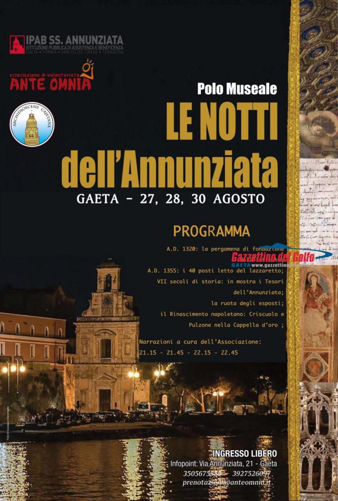 Il 27, 28 e 30 agosto tornano a Gaeta “Le Notti dell’Annunziata”, tre serate culturali organizzate dal Polo Museale di Gaeta, nato dalla sinergia tra l’Arcidiocesi di Gaeta e l’Ipab SS.ma Annunziata. Un suggestivo percorso che, grazie alle sapienti narrazioni dei volontari dell’associazione Ante Omnia, racconterà la storia del Pio Istituto fondato nell’anno 1320, le ricchezze artistiche della Cappella d’oro e la Mostra “I tesori dell’Annunziata”, per finire con la vita delle orfane affidate nei secoli alla “ruota degli esposti”.