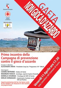 L’incontro sarà introdotto e moderato da ALESSANDRA ARENA, Presidente della Cooperativa Sociale “Programma 101” Onlus e Responsabile della Campagna “Gaeta non gioca d’azzardo”. Interverranno COSMO MITRANO – Sindaco di Gaeta; MAURIZIO FIASCO – sociologo, esperto di gioco d’azzardo e membro della Consulta Nazionale Antiusura; DANIELA CESARALE – Psicologa del Sert di Formia; EMILIO DONAGGIO – Commissario del Comitato locale Sud Pontino della Croce Rossa.