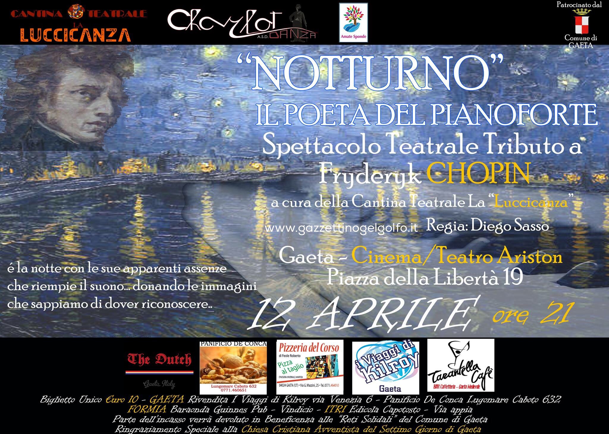 Lo Spettacolo, a cura della Cantina Teatrale La “Luccicanza” ideato, scritto e diretto da Diego Sasso, propone di rappresentare il percorso umano e artistico di colui che con le sue note é emerso come uno dei maggiori esponenti del Romanticismo della prima metà dell’800. Il Copione, riferisce per l’appunto, il contesto non solo artistico dei famigerati salotti ottocenteschi, ma anche le vicende storiche e politiche che condizionano la vita del Compositore polacco che in giovane età è costretto a trasferirsi in Francia a causa della Rivoluzione di Novembre del 1830. Nel paese dell’arte Chopin ha modo di esprimere la sua profondità compositiva e incontra e si confronta con i migliori Musicisti, Compositori e Artisti dell’epoca.. in particolare stringe rapporti d’amicizia con Franz Liszt e con il pittore Eugene Delacroix.. oltre che con Berlioz, Hiller e Vincenzo Bellini, anche lui trasferitosi in Francia per acquisire le tecniche compositive strumentali, ma l’incontro più importante è quello che Fryderyk Chopin ha con la scrittrice, attivista politica George Sand.. colei che sostiene il Socialismo libertario e che viene considerata una delle anticipatrici del Femminismo (fu lei a fare le prime proposte di legge sul Divorzio) Donna che incanta e stravolge Chopin con il suo straordinario vortice di Forza e Dolcezza di eccentrica apparenza vestendosi da Uomo e fumando la pipa.. ma allo stesso tempo gentile e delicata nel corteggiarlo e innamorandosi con tutte le bellezze del Romanticismo. Il compositore l’amerà per tutta la sua breve vita anche dopo la drammatica separazione.. così come per tutta la vita resta profondamente legato alla sua amata patria, la Polonia, dove non farà più rientro.. se non grazie a sua sorella Ludwika.