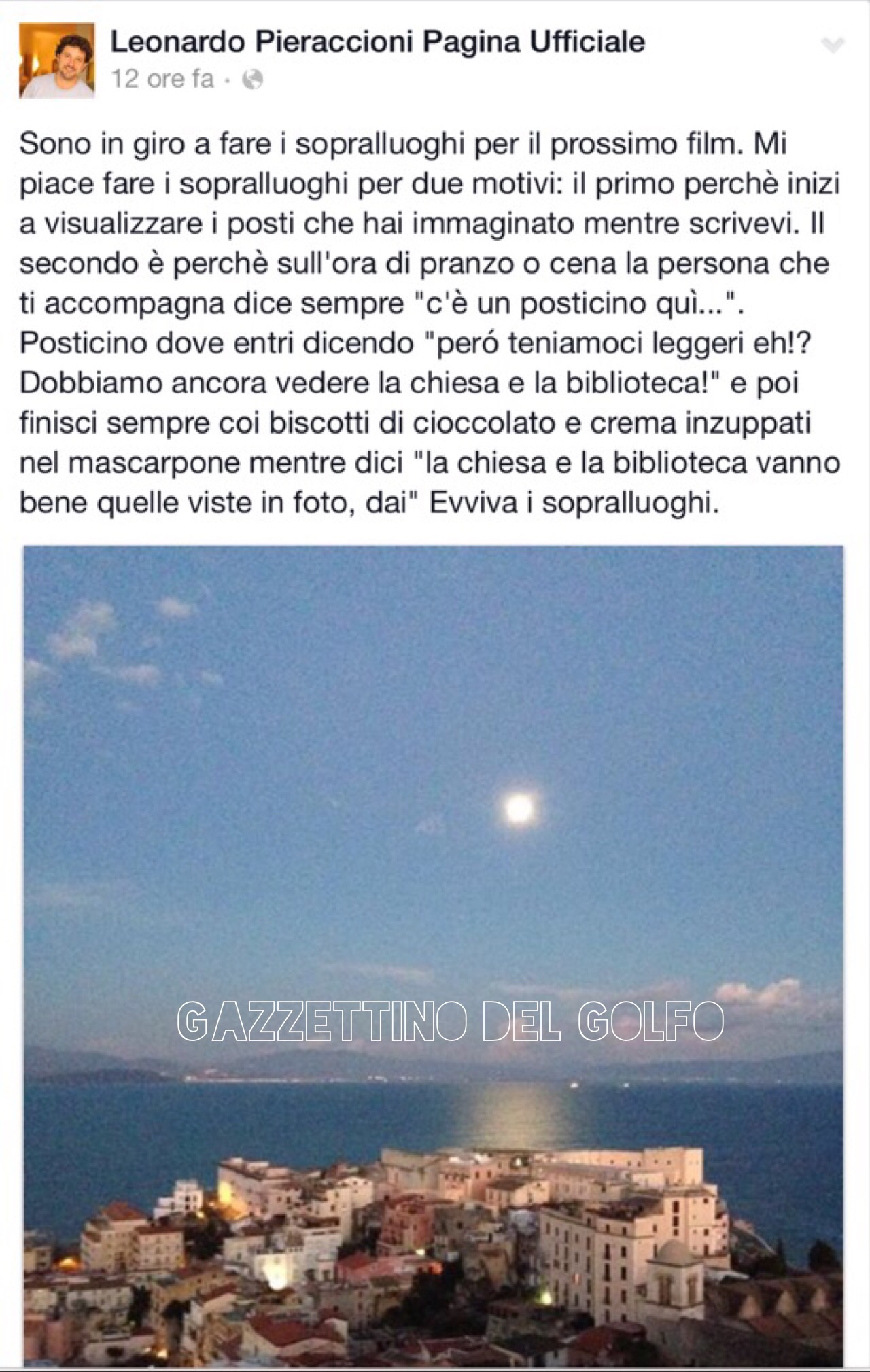 Si legge nel post: “Sono in giro a fare i sopralluoghi per il prossimo film. Mi piace fare i sopralluoghi per due motivi: il primo perchè inizi a visualizzare i posti che hai immaginato mentre scrivevi. Il secondo è perchè sull’ora di pranzo o cena la persona che ti accompagna dice sempre “c’è un posticino quì…”. Posticino dove entri dicendo “peró teniamoci leggeri eh!? Dobbiamo ancora vedere la chiesa e la biblioteca!” e poi finisci sempre coi biscotti di cioccolato e crema inzuppati nel mascarpone mentre dici “la chiesa e la biblioteca vanno bene quelle viste in foto, dai” Evviva i sopralluoghi.”