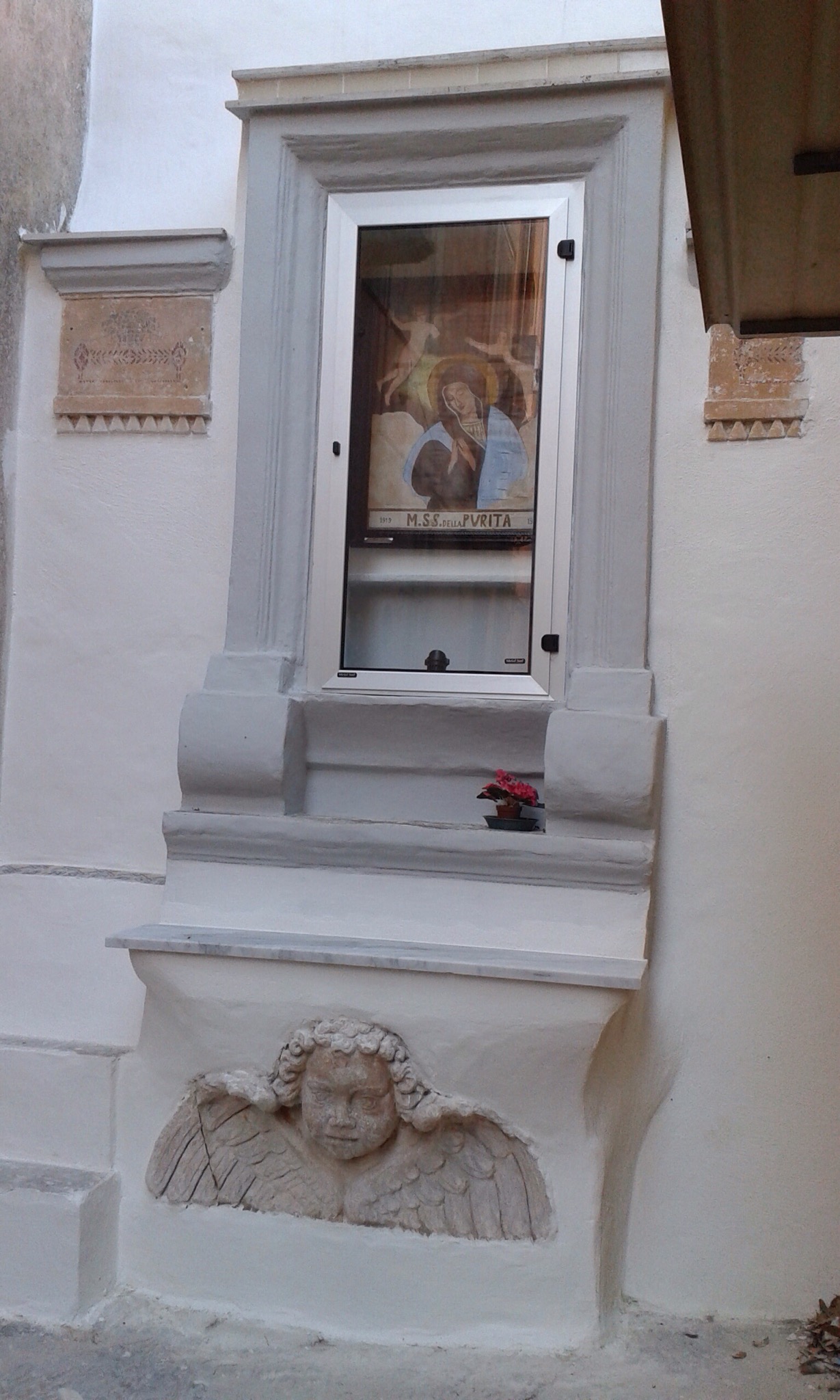 Restaurata l’Edicola di Via Indipendenza Vico 13 lato monte, in prossimità della Chiesa di San Giacomo, ubicata in fondo al Vicolo, in cui viene riportata l’immagine sacra del dipinto della Madonna della Purità. Alla base del tempio viene raffigurato il viso di un Angelo in pietra con due ali spiegate in pietra.