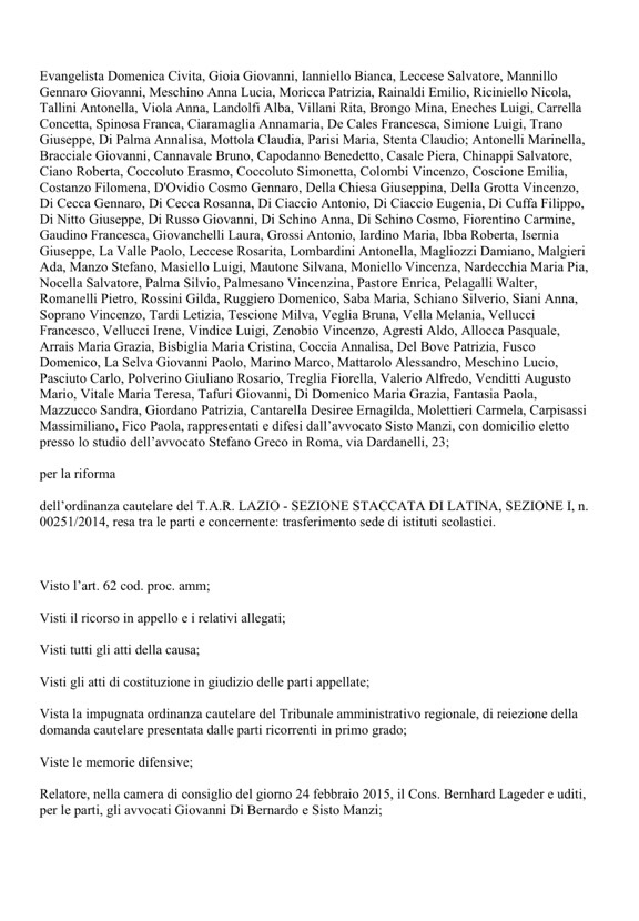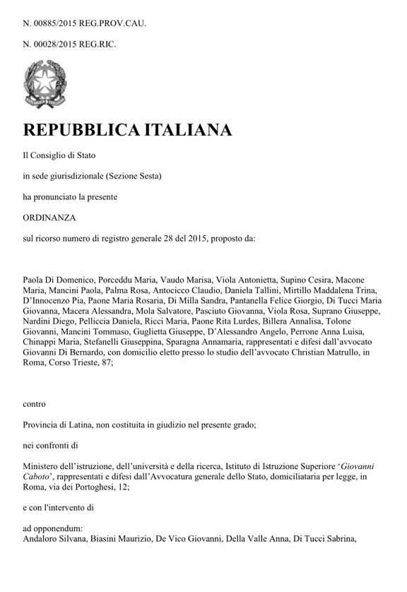 La storia ha avuto inizio quando la Provincia di Latina, con nota del Dirigente del settore del 28 luglio 2014, in attuazione del piano regionale di dimensionamento delle Istituzioni scolastiche A.S. 2014/2015, stabilì il trasferimento delle attività didattiche del “Fermi” dalla sua sede storica ubicata in Piazza Trieste, presso la struttura di “Calegna” di recente ristrutturata. Immediata fu la reazione dell’intera comunità del “Fermi che, tramite gli Avv.ti Giovanni Di Bernardo ed Antonio Contini impugnò il provvedimento ottenendo, nel successivo mese di Agosto, dal Tar di Latina, la sospensione monocratica del provvedimento e la fissazione dell’udienza per la decisione definitiva al successivo 8 ottobre 2014. Si costituirono nel giudizio 133 tra docenti, genitori di alunni e personale Ata del “Caboto” tramite l’Avv.to Sisto Manzi ed il Tar del Lazio sezione distaccata di Latina in data 9 ottobre accogliendo le richieste del “Caboto” ribaltò il provvedimento iniziale e stabilì che la decisione del trasferimento delle attività didattiche dello scientifico presso la sede di “Calegna” è “quella che realizza il miglior bilanciamento degli interessi coinvolti, permettendo l’ordinato svolgimento dell’attività didattica di tutti gli istituti interessati”. La decisione del Tar Lazio sezione distaccata di Latina è stata impugnata dalla comunità del “Fermi” tramite l’Avv.to Giovanni Di Bernardo ed è stata fissata per la decisione definitiva presso il Consiglio di Stato l’udienza del 24 febbraio. La Provincia non ha partecipato al giudizio, ma lo hanno fatto oltre 100 soggetti tra professori, genitori di alunni e personale ATA del “Caboto” rappresentati dall’Avv.to Sisto Manzi del foro di Latina.