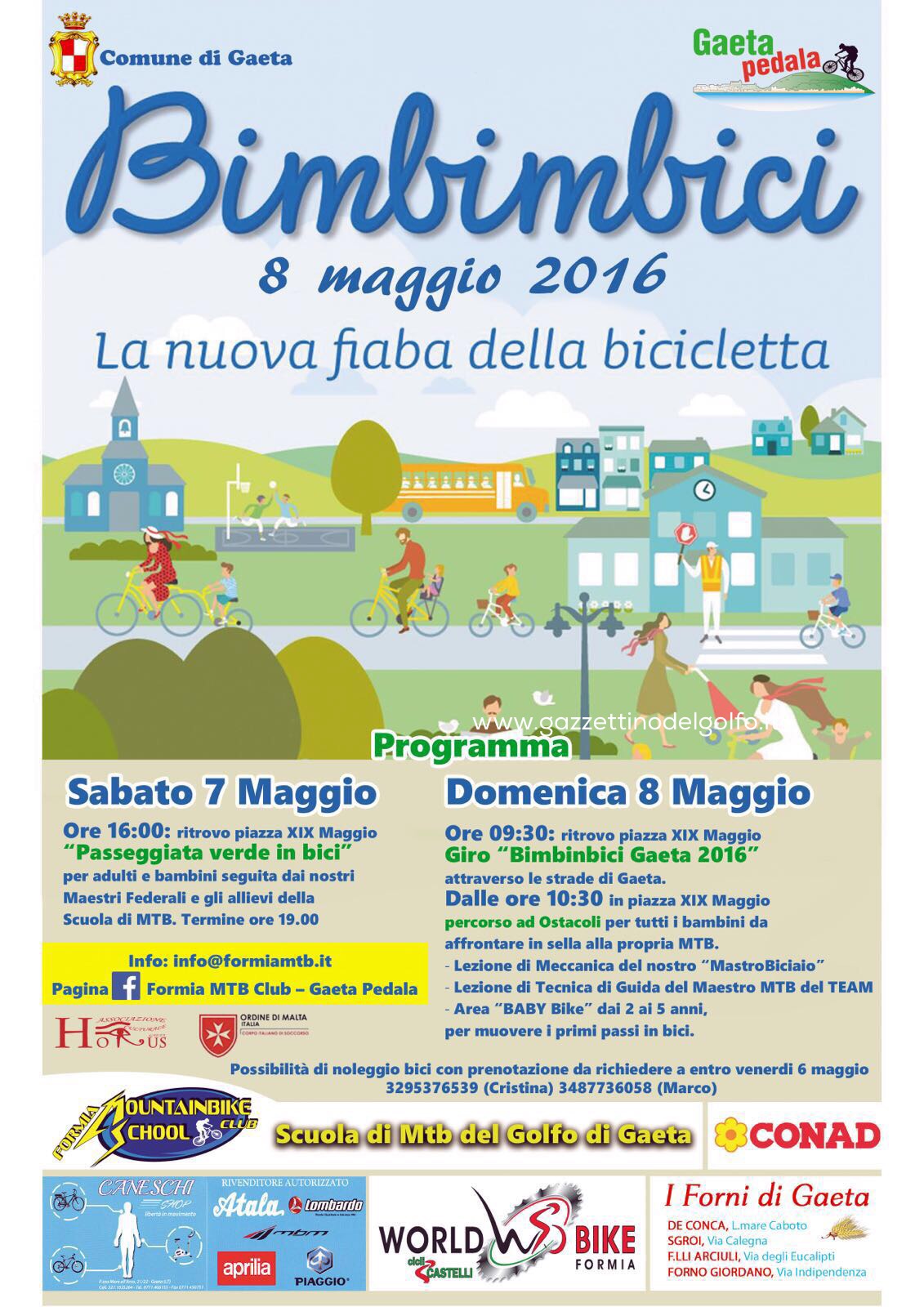 A Gaeta sabato 7 e domenica 8 maggio 2016 ritorna Bimbimbici, la pedalata in città che coinvolge grandi e piccini. Un evento nazionale, organizzato dalla FIAB (Federazione Italiana Amici della Bicicletta – Onlus ambientalista) che intende promuovere l’utilizzo della bicicletta come mezzo di trasporto quotidiano in alternativa all’uso dell’automobile. Obiettivo primario: favorire la mobilità urbana sostenibile.