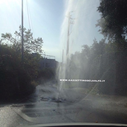 Oltre all’ingente perdita d’acqua, il geyser che si è formato alto oltre due metri, impedisce una normale circolazione veicolare. La foto, inviataci da un lettore, evidenzia l’altezza del getto d’acqua che fuoriesce dalla tubatura sottostante con grande pressione.