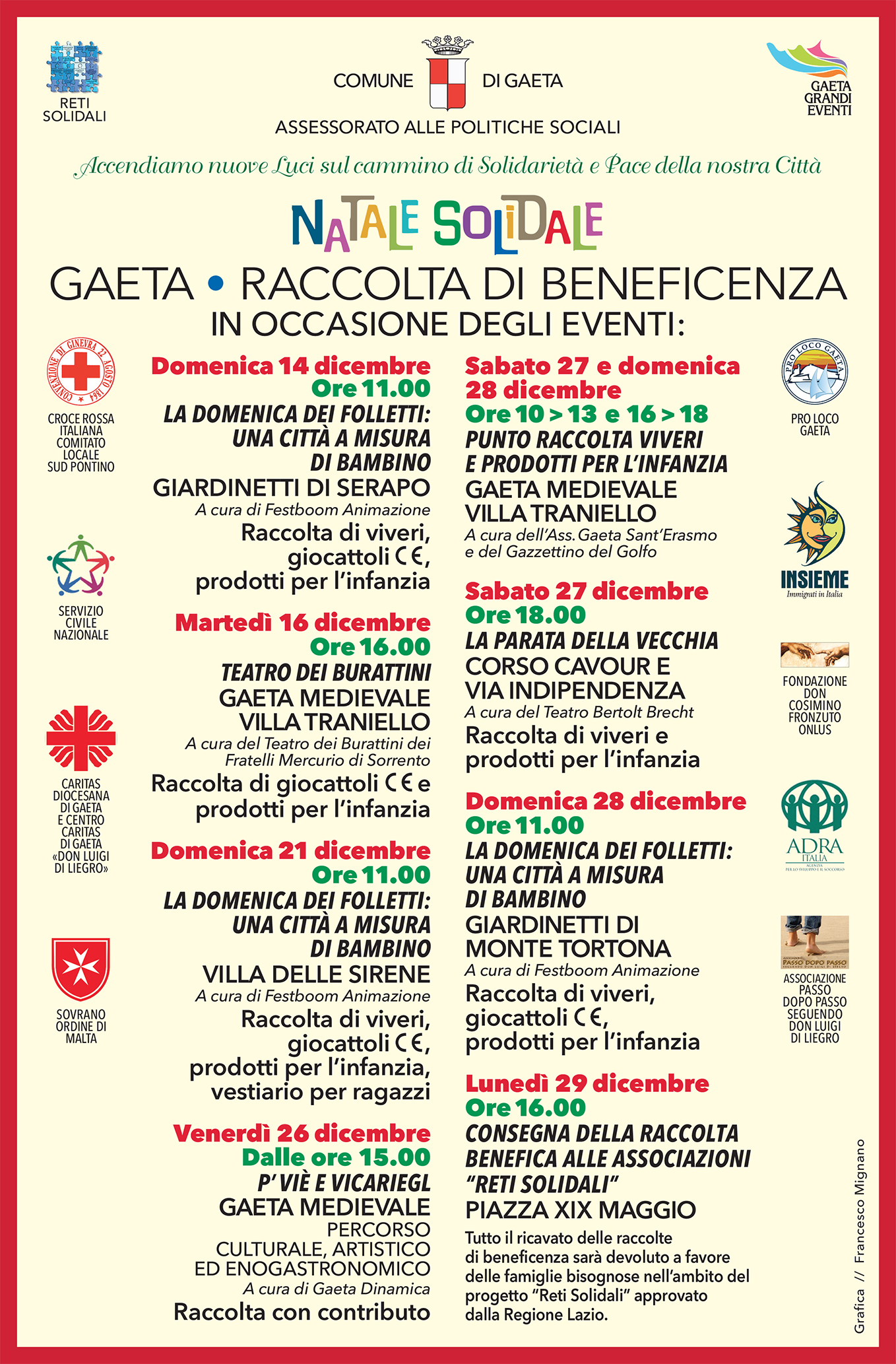 Lo spettacolo si inserisce all’interno delle iniziative di “Natale Solidale“, promosso dal Comune – Assessorato ai Servizi alla Persona e rivolto a tutti coloro che vogliono condividere lo spirito del Natale nel modo più vero e profondo. “Natale Solidale”, ha l’obiettivo di raccogliere fondi, viveri e generi di prima infanzia da destinare alle famiglie bisognose della città, nell’ambito del progetto “Reti Solidali” del Comune di Gaeta, approvato dalla Regione Lazio.