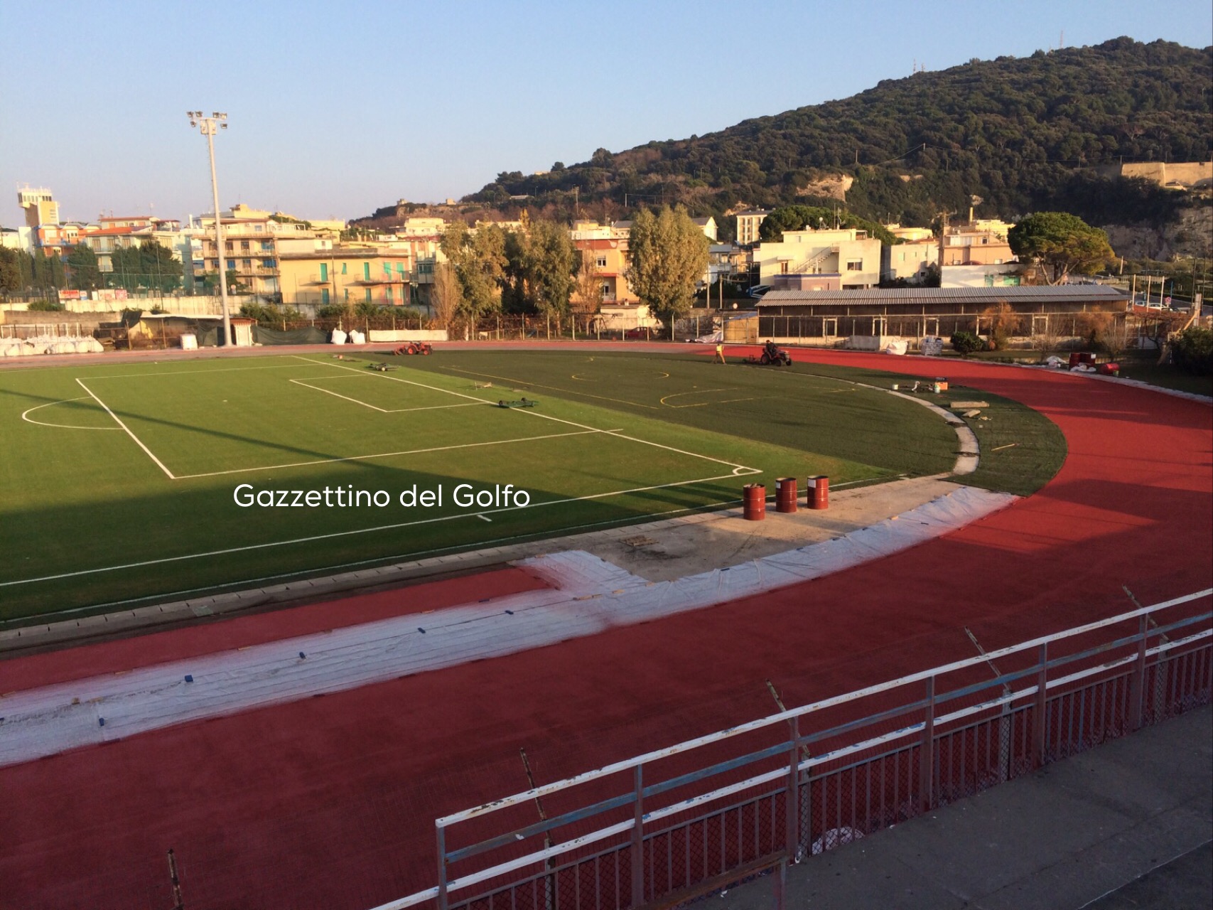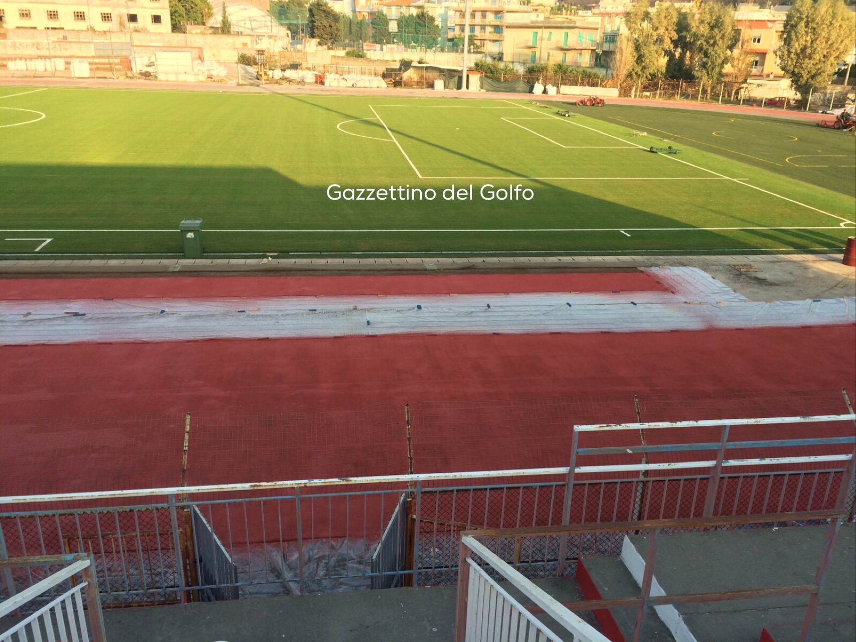 La ditta che sta eseguendo i lavori, sta ultimando la sistemazione della pista atletica che costeggia il rettangolo di gioco.