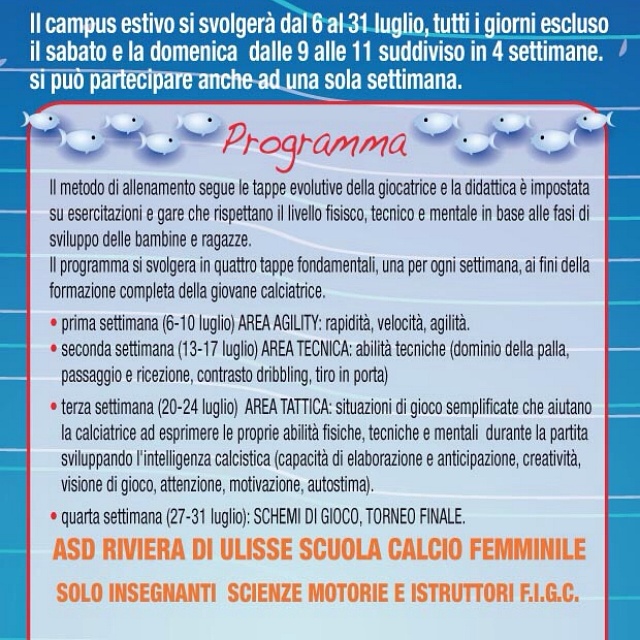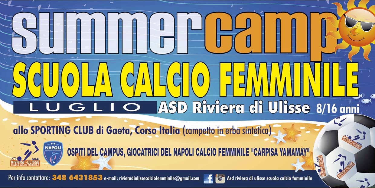 Tutto è pronto per il SUMMER CAMP, l’iniziativa della Scuola Calcio Femminile ASD Riviera di Ulisse riservato a bambine e ragazze dai 6 ai 16 anni. Un Campus di 4 settimane che, per tutto luglio, si terrà presso il campetto in erba sintetica dello Sporting Club di Gaeta (Corso Italia). Si potrà partecipare anche a solo una delle settimane che vedranno, quali animatori, solo insegnanti di scienze motorie e istruttori F.I.G.C.