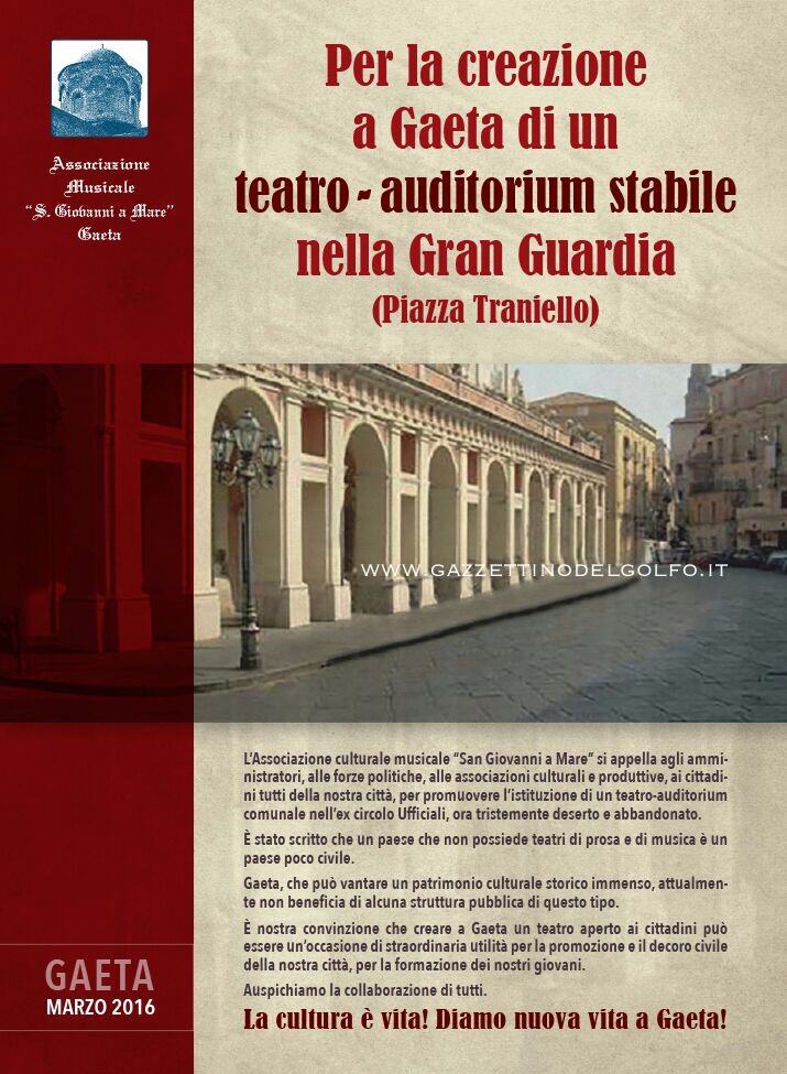 L’Associazione culturale musicale “San Giovanni a Mare” si appella agli amministratori, alle forze politiche, alle associazioni culturali e produttive, ai cittadini tutti della nostra città, per promuovere l’istituzione di un teatro-auditorium comunale nell’ex circolo Ufficiali, ora tristemente deserto e abbandonato. E’ stato scritto che un paese che non possiede teatri di posa e di musica è un paese poco civile. Gaeta, che può vantare un patrimonio culturale storico immenso, attualmente non beneficia di alcuna struttura pubblica di questo tipo. E’ nostra convinzione che creare a Gaeta un teatro aperto ai cittadini può essere un’occasione di straordinaria utilità per la promozione e il decoro civile della nostra città, per la formazione dei nostri giovani.