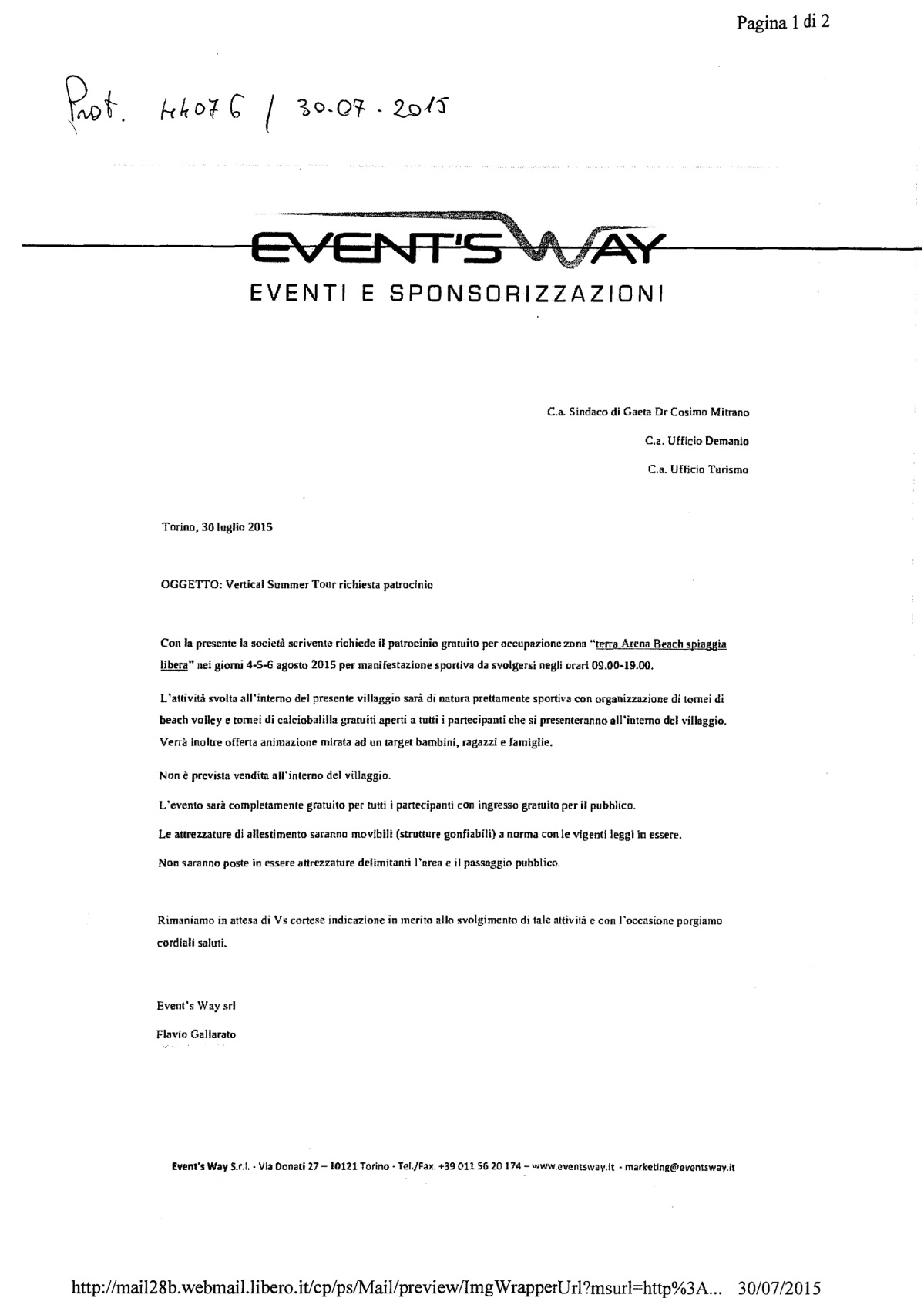 • copia della mail di rinuncia da parte della Event’s Way srl all’organizzazione dell’evento a Gaeta;