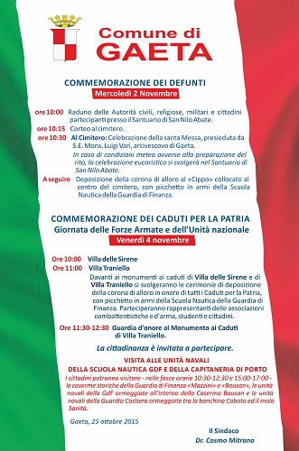 Il programma delle celebrazioni organizzate dal Comune prevede: mercoledì 2 novembre 2016, il corteo delle autorità civili, religiose, militari e di tutti i cittadini che vorranno partecipare, verso il cimitero comunale. Il ritrovo è fissato per le ore 10 presso il Santuario di San Nilo Abate. Alle ore 10.30 al cimitero, sarà officiata la Santa Messa dall’Arcivescovo di Gaeta S. E. Monsignor Luigi Vari . In caso di condizioni meteorologiche avverse, la celebrazione eucaristica si svolgerà nella Chiesa di S. Nilo Abate.
