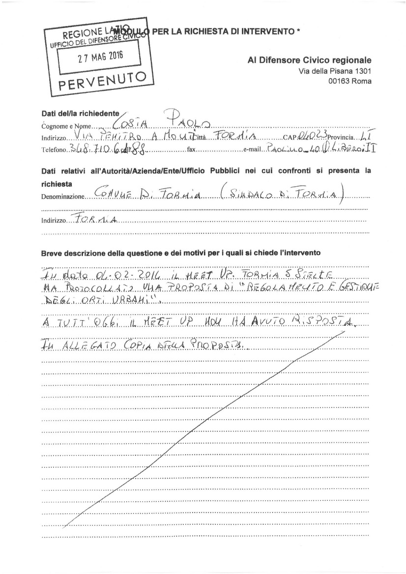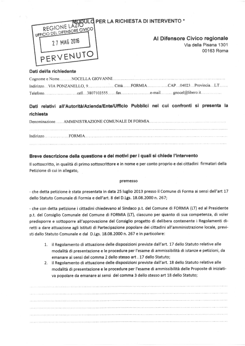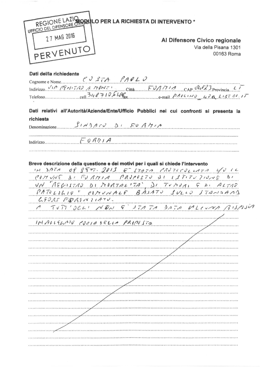 Due nostri attivisti si sono quindi recati ieri presso gli Uffici della Regione Lazio ed hanno protocollato, dopo breve ma approfondito e proficuo confronto col funzionario di turno, le tre richieste di intervento del Difensore Civico Regionale.