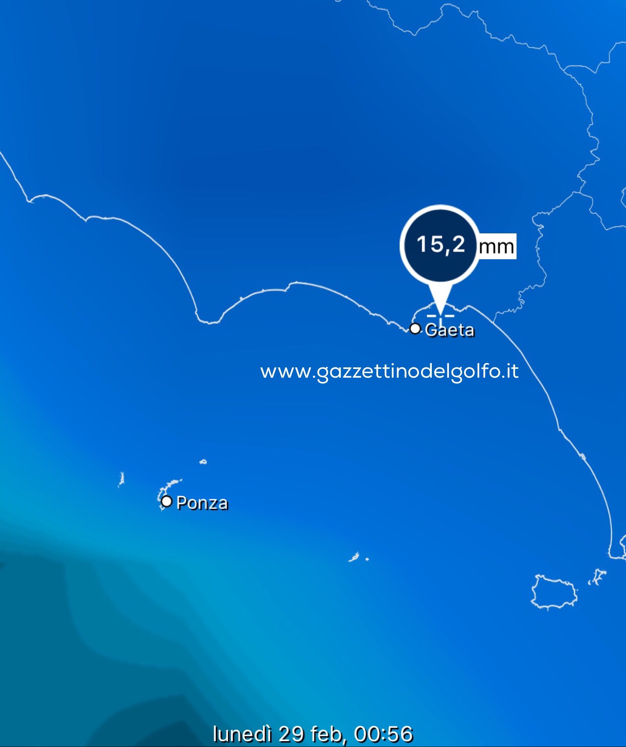 - La giornata di lunedì 29 febbraio sarà caratterizzata da cieli molto nuvolosi o coperti con piogge e rovesci anche temporaleschi; fenomeni in attenuazione nelle ore pomeridiane. Si attendono circa 30mm di pioggia. Variazione nelle temperature massime che dovrebbe scendere di 4/5ºC rispetto alla giornata di domenica, invariata la minima. Venti deboli direzione Sud/Sud-Est e mare molto mosso.