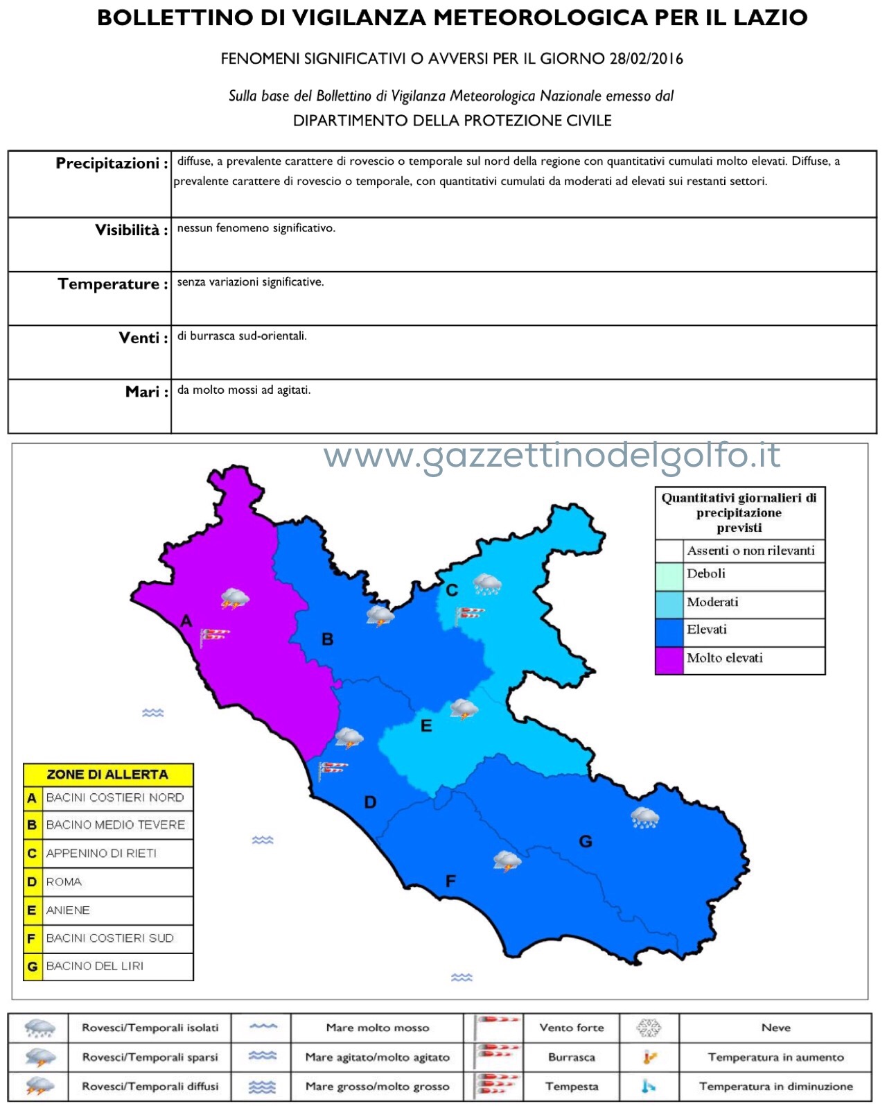 - Per la giornata di domenica 28 febbraio, si attende un complessivo peggioramento in particolare nelle ore pomeridiane e serali. Sono previsti circa 55mm di pioggia. Le temperature varieranno dalla minima di 12ºC, ad una massima di 17ºC. Venti moderati Este/Sud-Est e mare molto mosso. ALLERTA METEO PER PIOGGIA.