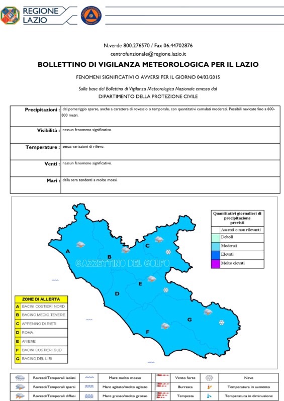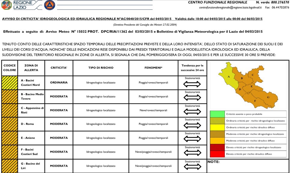 Il Centro Funzionale Regionale rende noto che dal pomeriggio-sera di oggi 04.03.2015 e per le successive 24-36 ore, si prevedono sul Lazio: precipitazioni diffuse anche a carattere di rovescio o temporale. I fenomeni saranno accompagnati da rovesci di forte intensità, frequente attività elettrica, e forti raffiche di vento. Si prevedono inoltre venti forti dai quadranti settentrionali, con raffiche fino a burrasca forte e possibili mareggiate sulle coste esposte. Si prevedono in estensione anche nevicate sulle zone interne della regione con quota neve in abbassamento fino a 400-500 metri.
