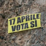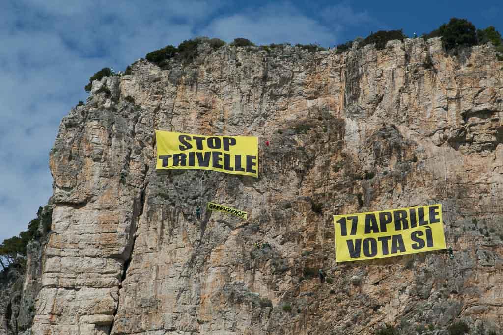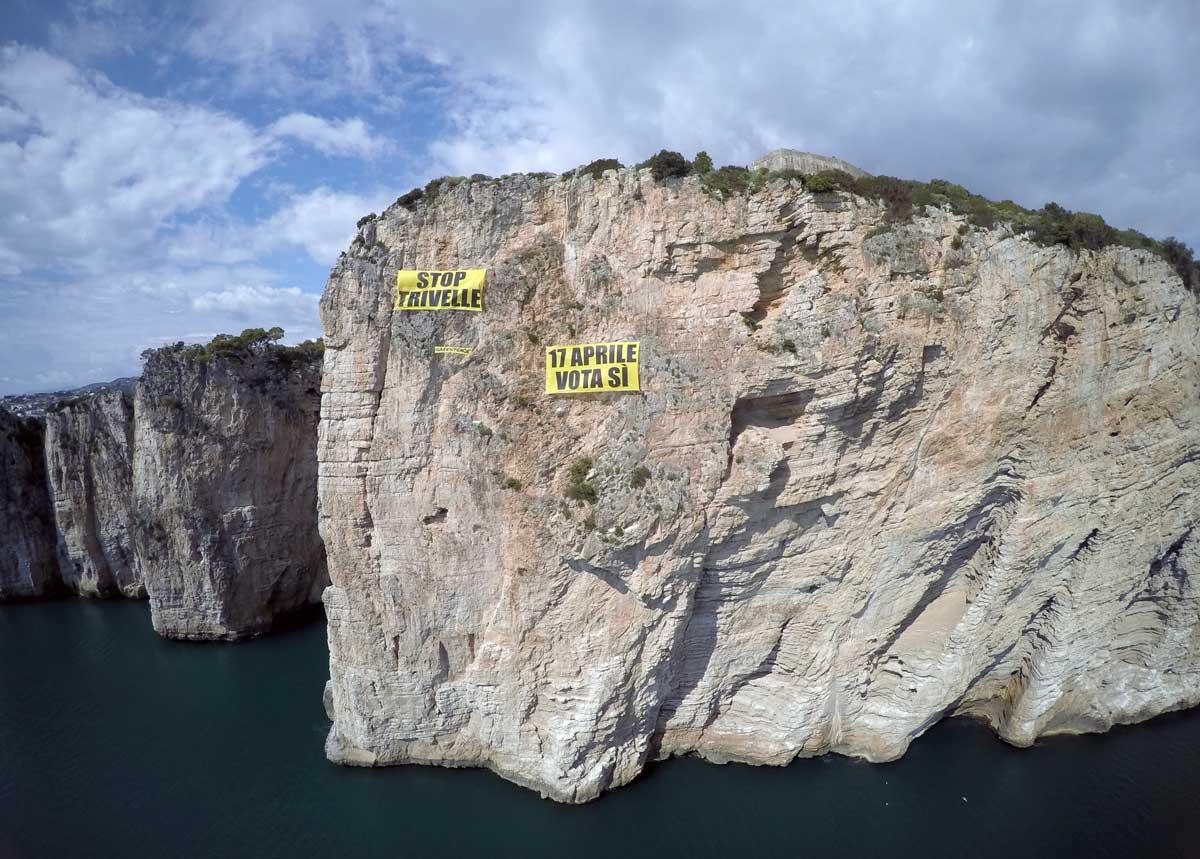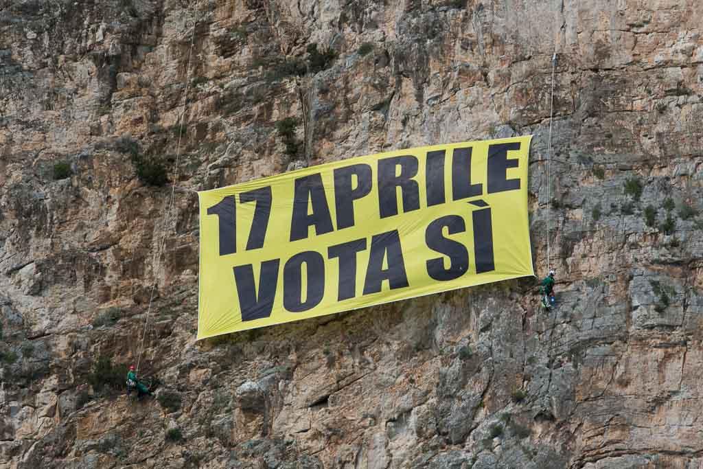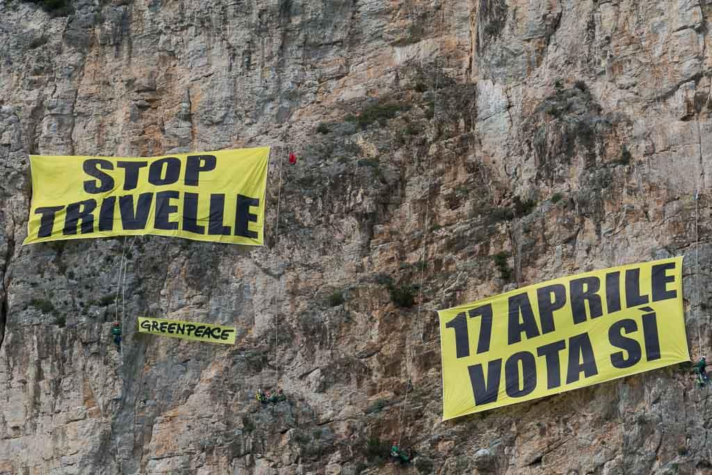 In quella data si voterà per abrogare la parte di una legge che permette, a quanti hanno ottenuto concessioni per estrarre gas o petrolio da piattaforme offshore entro 12 miglia marittime, di rinnovarle fino all’esaurimento del giacimento. I climber di Greenpeace hanno aperto due enormi striscioni, per un totale di circa 250 metri quadrati, dove si poteva leggere: “Stop trivelle, il 17 aprile vota sì”.