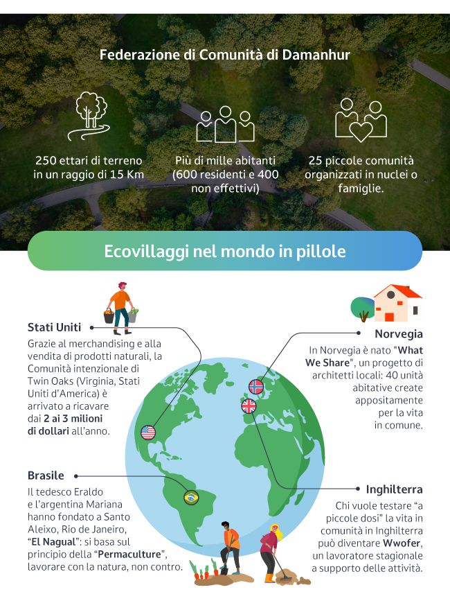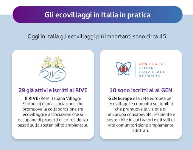 Si tratta di vere e proprie comunità ecologiche diffuse in tutto il mondo. Come riporta l’infografica “Cercando posti al green: gli ecovillaggi in Italia” realizzata da VIVI Energia, in Italia ce ne sono 45, di cui 29 già attive e iscritte al RIVE (Rete Italiana Villaggi Ecologici), il principale ente italiano che promuove i rapporti sinergici tra gli ecovillaggi e le associazioni di sostenibilità ambientale.