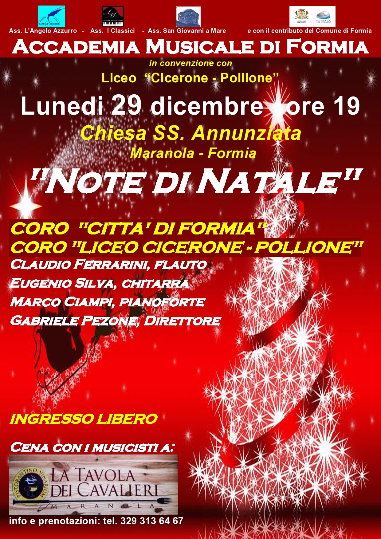 Si terrà lunedì 29 dicembre alle ore 19 presso la Chiesa della S.S. Annunziata di Maranola “Note di Natale”, il concerto dei cori “Città di Formia” e “Liceo Classico Cicerone-Pollione” diretti dai maestri Gabriele Pezone e Marco Ciampi. L’appuntamento, inserito nella rassegna “I luoghi sacri”, fa parte del cartellone di eventi promosso dall’Assessorato alla Cultura per le festività natalizie.