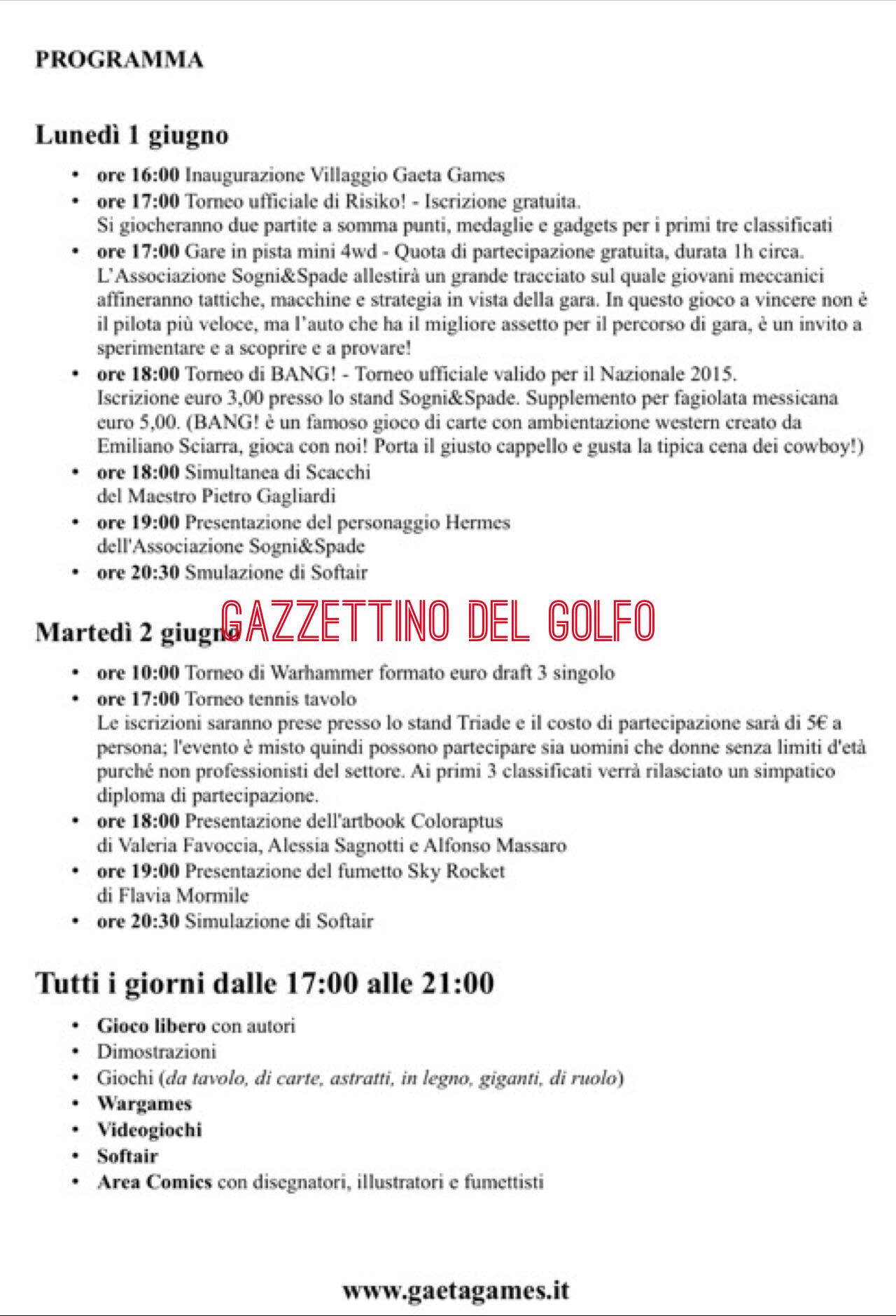 Non dimentichiamo poi i creatori di giochi da tavolo pronti a coinvolgerci con le loro realizzazioni e le associazioni ludico-sportive tra cui l’Associazione Sportiva e Culturale Quattro-di, la quale promuoverà la simultanea di scacchi che si terrà il 1 giugno alle ore 18.00, e la Tropic Thunder ASD Airsoft Gaeta che curerà il torneo di SoftAir che vi aspetta lunedì 1 giugno alle ore 20.30.