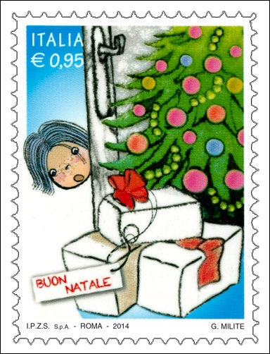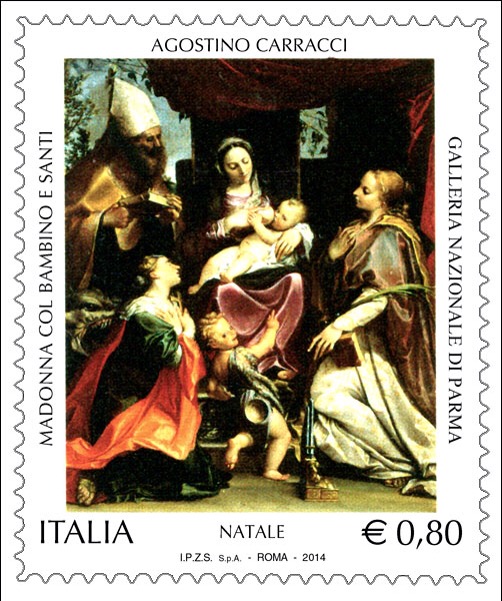 Ad esempio, il 1 dicembre di quest’anno Poste Italiane ha emesso due 2 francobolli da 0,80 e 0,95 euro, che rappresentano rispettivamente la tela di Agostino Carracci “Madonna col Bambino e Santi”, dipinta nel 1586 e conservata presso la Galleria Nazionale di Parma e il volto stupito di una bambina che, da dietro una porta, guarda i regali che sono sotto l’albero.